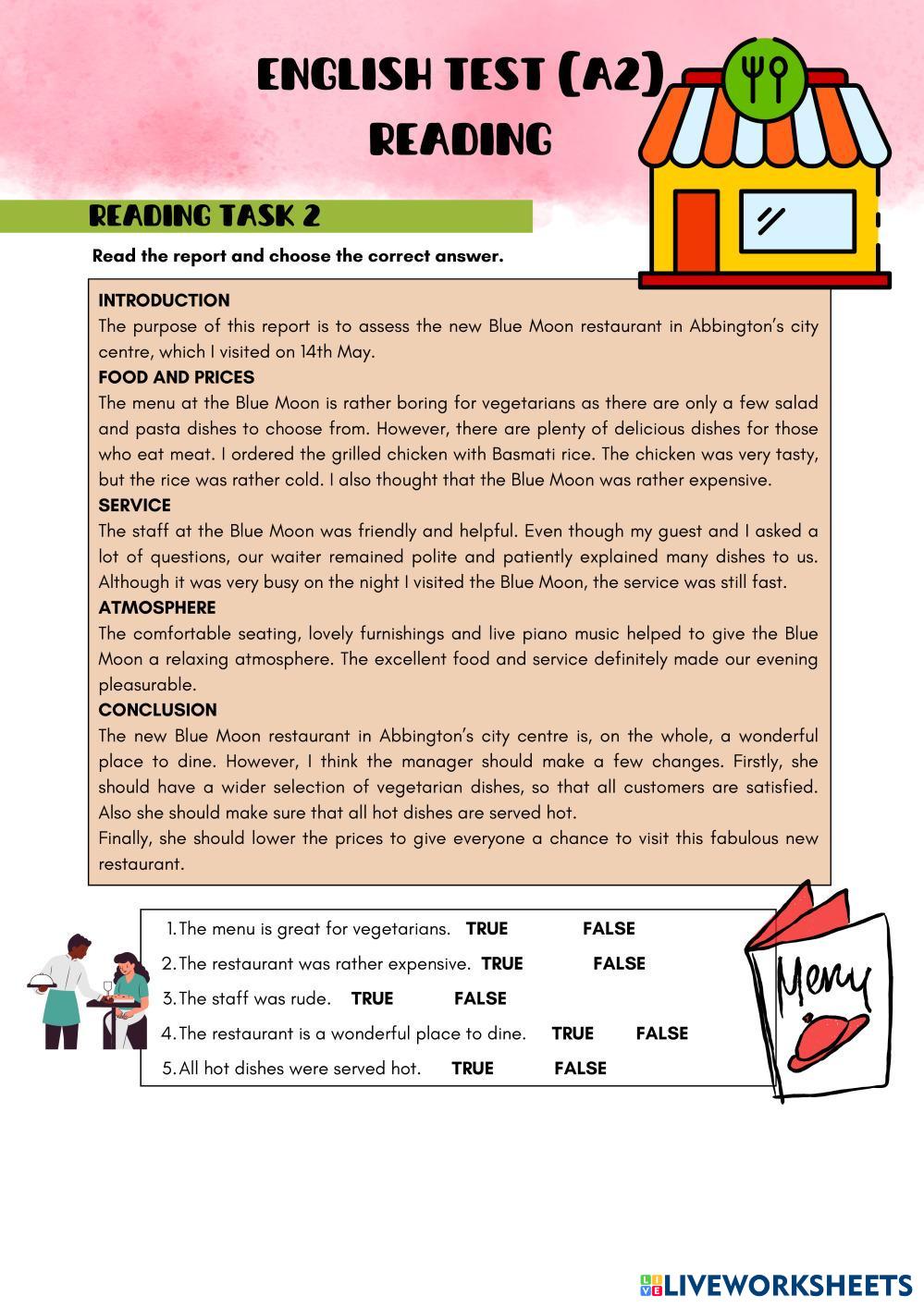 Created by englishzonet English reading Age 13+ level: medio Spanish Author's Instructions My Google Classroom Courses × 0 classes selected (0 students total) Quick Access Select all classes (0 classes) All Classes Loading courses... Cancel Share Share to selected Course __COURSE_NAME__ __STUDENT_NAME__ (__STUDENT_EMAIL__) Reading test A2 Download Worksheet Validation Check my answers Emails my answers to my teacher Full name Group/level School subject Teacher's email or key code Close Submit Validating worksheet... (12) Your answers have been sent to your teacher. Good luck! OK We encountered an error submitting your answers. Please try again. OK Advertisement | Go Ad Free Created by englishzonet English reading Age 13+ level: medio Spanish Author's Instructions