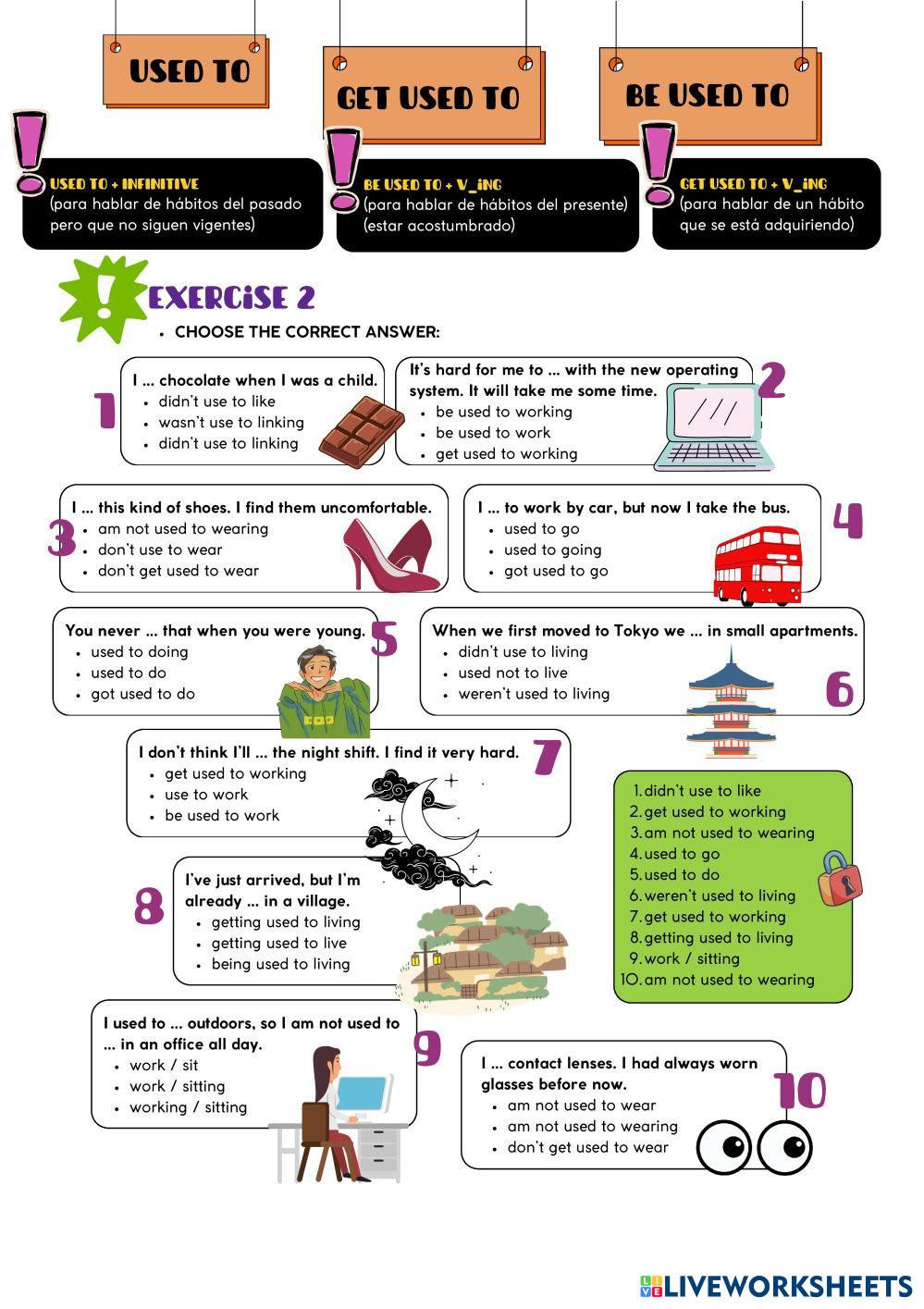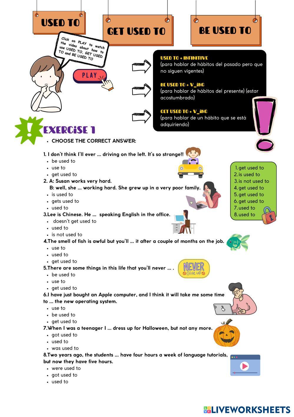 Created by englishzonet English used to, be used to, get used to Age 16+ level: medio Spanish Author's Instructions My Google Classroom Courses × 0 classes selected (0 students total) Quick Access Select all classes (0 classes) All Classes Loading courses... Cancel Share Share to selected Course __COURSE_NAME__ __STUDENT_NAME__ (__STUDENT_EMAIL__) English test (b1) Download Worksheet Validation Check my answers Emails my answers to my teacher Full name Group/level School subject Teacher's email or key code Close Submit Validating worksheet... (12) Your answers have been sent to your teacher. Good luck! OK We encountered an error submitting your answers. Please try again. OK Advertisement | Go Ad Free Created by englishzonet English used to, be used to, get used to Age 16+ level: medio Spanish Author's Instructions