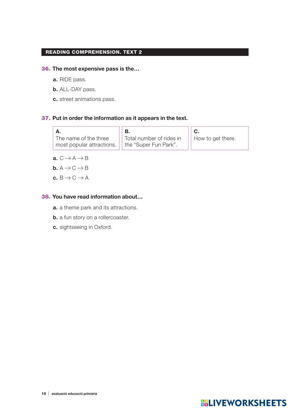 Created by lateacheranna English English Age 11-15 level: sixth grade Spanish Author's Instructions My Google Classroom Courses × 0 classes selected (0 students total) Quick Access Select all classes (0 classes) All Classes Loading courses... Cancel Share Share to selected Course __COURSE_NAME__ __STUDENT_NAME__ (__STUDENT_EMAIL__) Reading comprehension 2 (2020-2021) Download Worksheet Validation Check my answers Emails my answers to my teacher Full name Group/level School subject Teacher's email or key code Close Submit Validating worksheet... (12) Your answers have been sent to your teacher. Good luck! OK We encountered an error submitting your answers. Please try again. OK Advertisement | Go Ad Free Created by lateacheranna English English Age 11-15 level: sixth grade Spanish Author's Instructions