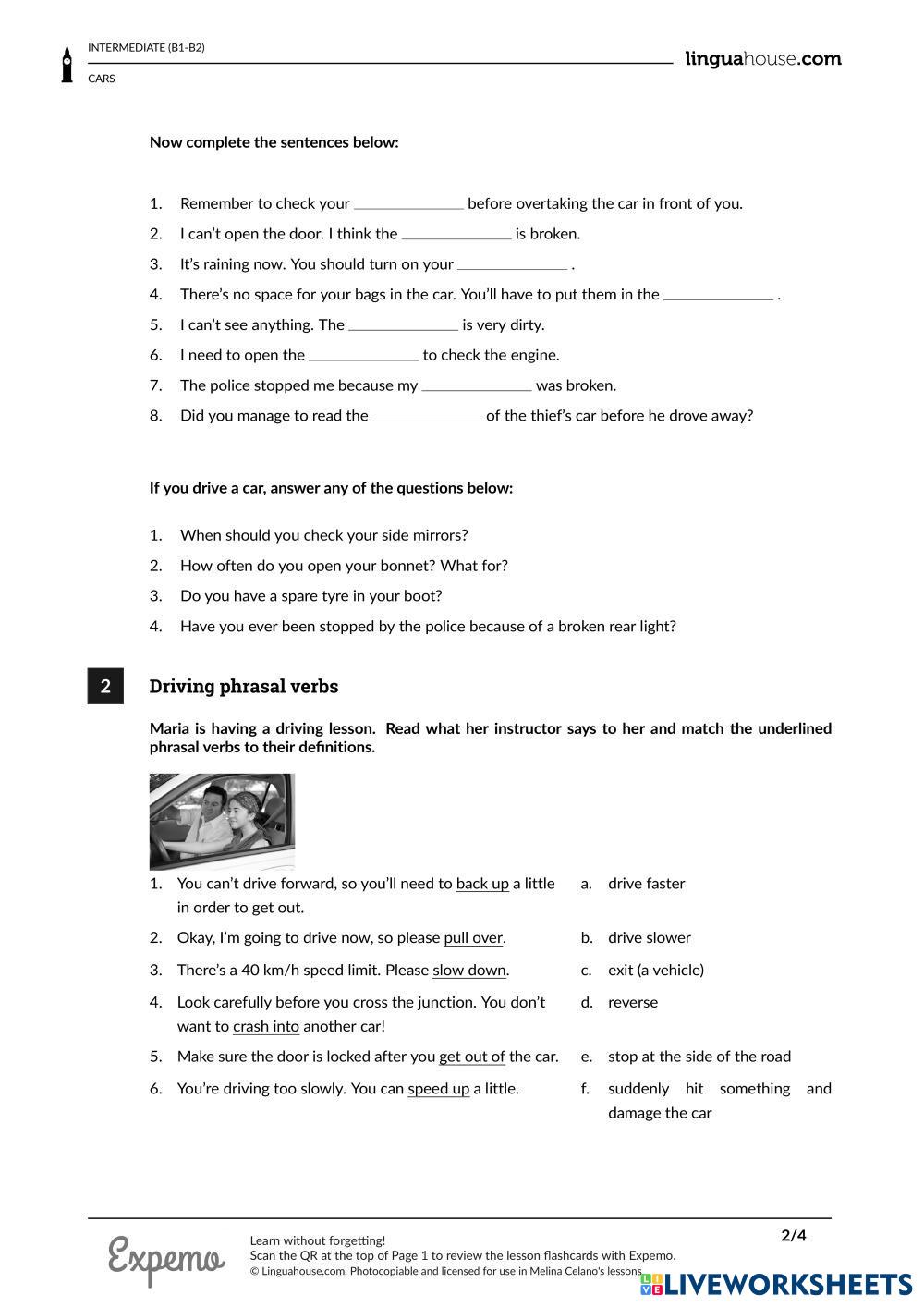 Created byCelano English vocabulary about cars Age 15+ level: B1 - B2 Spanish Author's Instructions My Google Classroom Courses × 0 classes selected (0 students total) Quick Access Select all classes (0 classes) All Classes Loading courses... Cancel Share Share to selected Course __COURSE_NAME__ __STUDENT_NAME__ (__STUDENT_EMAIL__) Parts of the Car Download Worksheet Validation Check my answers Emails my answers to my teacher Full name Group/level School subject Teacher's email or key code Close Submit Validating worksheet... (12) Your answers have been sent to your teacher. Good luck! OK We encountered an error submitting your answers. Please try again. OK Advertisement | Go Ad Free Created byCelano English vocabulary about cars Age 15+ level: B1 - B2 Spanish Author's Instructions