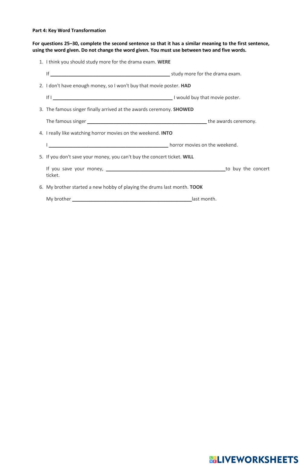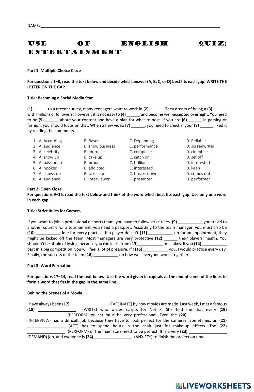 Created by jxy83 ESL English B1 Grammar Spanish Author's Instructions Read and answer. My Google Classroom Courses × 0 classes selected (0 students total) Quick Access Select all classes (0 classes) All Classes Loading courses... Cancel Share Share to selected Course __COURSE_NAME__ __STUDENT_NAME__ (__STUDENT_EMAIL__) Use of English Entertainment Download Worksheet Validation Check my answers Emails my answers to my teacher Full name Group/level School subject Teacher's email or key code Close Submit Validating worksheet... (12) Your answers have been sent to your teacher. Good luck! OK We encountered an error submitting your answers. Please try again. OK Advertisement | Go Ad Free Created by jxy83 ESL English B1 Grammar Spanish Author's Instructions Read and answer. Explore Worksheets E9-MIDTERM 2-LTV-24-25 ESL B1 E9-MIDTERM 2-LTV-24-25 Grammar - ESL .. Second conditional ESL B1 Second conditional Grammar - ESL Read and answer. Present Simple Tense ESL B1 Present Simple Tense Grammar - ESL Write the correct answer. English as a Second Language Main content: Present Simple Other contents: Subject verb agreement Present Perfect Simple - positive and negative ESL B1 Present Perfect Simple - positive and negative Grammar - ESL English as a second language Worksheet on present perfect simple Main content: Present perfect Other contents: present perfect simple, form, positive, negative