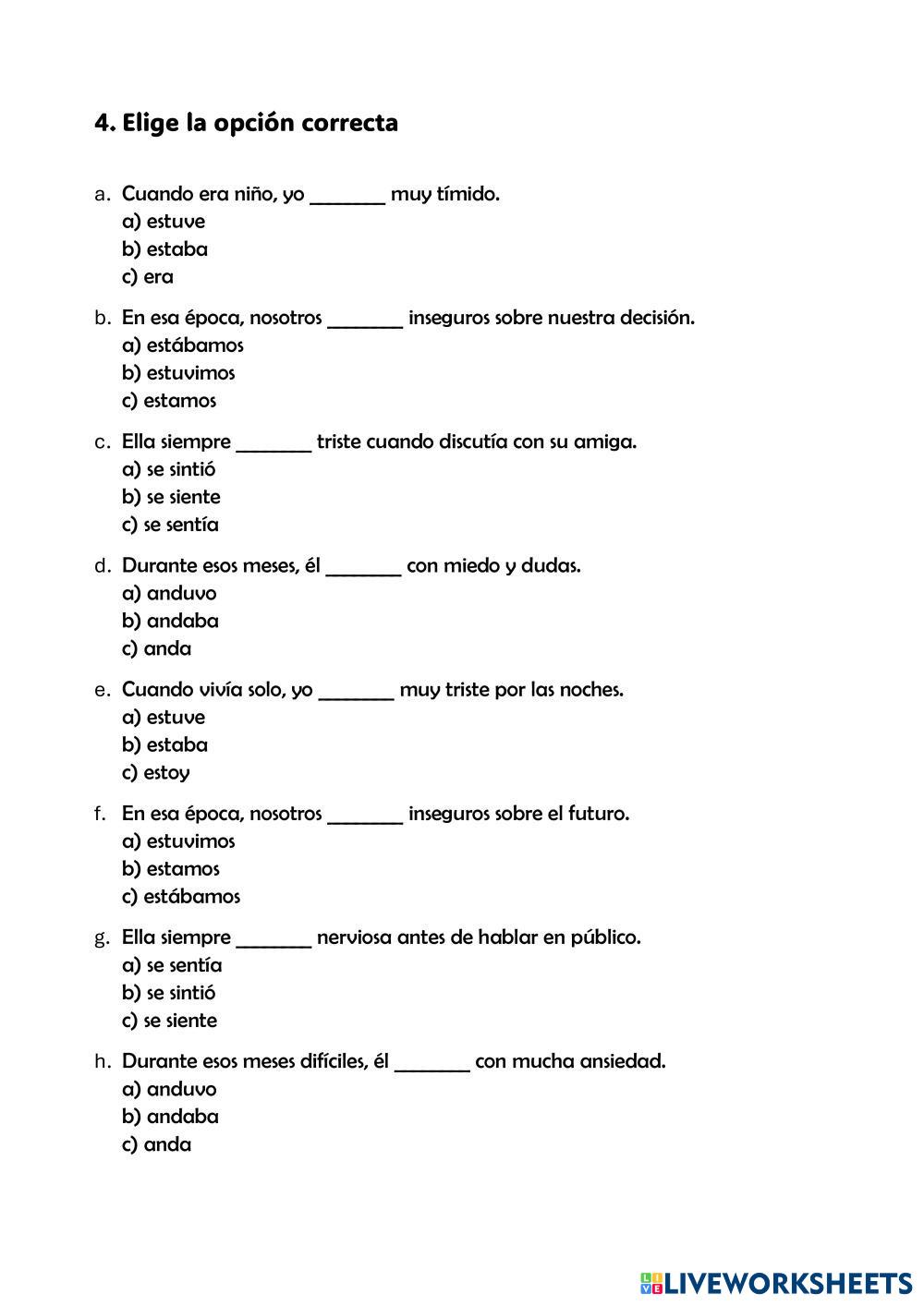 Created by Spanishih ESL Spanish B1 Grammar Spanish Author's Instructions Realice los siguientes ejercicios My Google Classroom Courses × 0 classes selected (0 students total) Quick Access Select all classes (0 classes) All Classes Loading courses... Cancel Share Share to selected Course __COURSE_NAME__ __STUDENT_NAME__ (__STUDENT_EMAIL__) Describir el estado emocional en el pasado Download Worksheet Validation Check my answers Emails my answers to my teacher Full name Group/level School subject Teacher's email or key code Close Submit Validating worksheet... (12) Your answers have been sent to your teacher. Good luck! OK We encountered an error submitting your answers. Please try again. OK Advertisement | Go Ad Free Created by Spanishih ESL Spanish B1 Grammar Spanish Author's Instructions Realice los siguientes ejercicios Explore Worksheets Verbos Regulares en el Pretérito ESL B1 Verbos Regulares en el Pretérito Grammar - ESL Realice los siguientes ejercicios en el pretérito Conjugación de verbos regulares en el pasado imperfecto del indicativo ESL B1 Conjugación de verbos regulares en el pasado imperfecto del indicativo Grammar - ESL Completa las siguientes oraciones con la forma correcta del verbo en pretérito imperfecto. Dos acciones simultaneas en el pasado ESL B1 Dos acciones simultaneas en el pasado Grammar - ESL Resuelva los siguientes ejercicios ¿Sustantivo, verbo o adjetivo? ESL B1 ¿Sustantivo, verbo o adjetivo? Grammar - ESL arrastra cada palabra a la caja que corresponda segùn clase gramatical