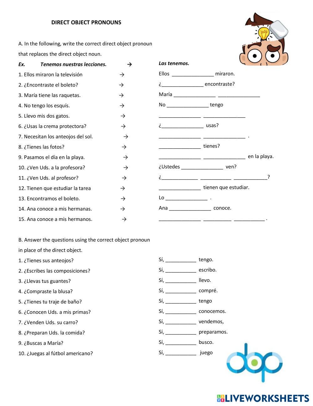 Created byAndres Contreras ESL Spanish A2 Grammar Spanish Author's Instructions Write the correct direct object pronoun that replaces the direct object noun. Answer the questions using the correct object pronoun in place of the direct object. My Google Classroom Courses × 0 classes selected (0 students total) Quick Access Select all classes (0 classes) All Classes Loading courses... Cancel Share Share to selected Course __COURSE_NAME__ __STUDENT_NAME__ (__STUDENT_EMAIL__) DOP DIRECT OBJECT PRONOUNS Download Worksheet Validation Check my answers Emails my answers to my teacher Full name Group/level School subject Teacher's email or key code Close Submit Validating worksheet... (12) Your answers have been sent to your teacher. Good luck! OK We encountered an error submitting your answers. Please try again. OK Advertisement | Go Ad Free Created byAndres Contreras ESL Spanish A2 Grammar Spanish Author's Instructions Write the correct direct object pronoun that replaces the direct object noun. Answer the questions using the correct object pronoun in place of the direct object. Explore Worksheets PRESENT CONTINUOUS PRACTICE ESL A2 PRESENT CONTINUOUS PRACTICE Grammar - ESL Complete the dialogues with the verbs in brackets in the present continuous tense. Pronombres Personales ESL A2 Pronombres Personales Grammar - ESL drag and drop EL PASADO ESL A2 EL PASADO Grammar - ESL Ejercitar las conjugaciones del tiempo pasado y sus diferencias según el infinitivo: ar, er. ir Maroon 5 - It Was Always You ESL A2 Maroon 5 - It Was Always You Grammar - ESL Fill in the spaces with the correct Simple Past form of the verb To Be (was/were).