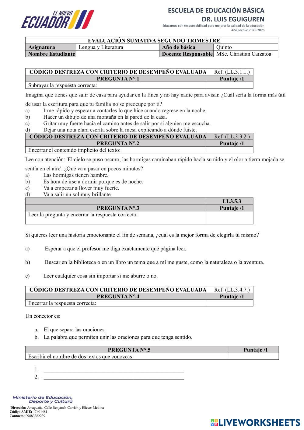 Created byChristian ESL A1 Listening Spanish Author's Instructions LEA DETENUDAMENTE CADA PREGUNTA My Google Classroom Courses × 0 classes selected (0 students total) Quick Access Select all classes (0 classes) All Classes Loading courses... Cancel Share Share to selected Course __COURSE_NAME__ __STUDENT_NAME__ (__STUDENT_EMAIL__) EVALUACION DE LL_T2 Download Worksheet Validation Check my answers Emails my answers to my teacher Full name Group/level School subject Teacher's email or key code Close Submit Validating worksheet... (12) Your answers have been sent to your teacher. Good luck! OK We encountered an error submitting your answers. Please try again. OK Advertisement | Go Ad Free Created byChristian ESL A1 Listening Spanish Author's Instructions LEA DETENUDAMENTE CADA PREGUNTA Explore Worksheets Greetings Rodrigo LST ESL A1 Greetings Rodrigo LST Listening - ESL LISTEN AND MATCH. Greetings Rodrigo LS ESL A1 Greetings Rodrigo LS Listening - ESL LISTEN AND MATCH. WEATHER ESL A1 WEATHER Listening - ESL Watch the video and mark the words you hear. Fracciones - unir con flechas ESL A1 Fracciones - unir con flechas Listening - ESL Ejercicio de unir con flechas para practicar las fracciones, su representación y su lectura. Para niños y niñas de 3º o 4º de primaria.