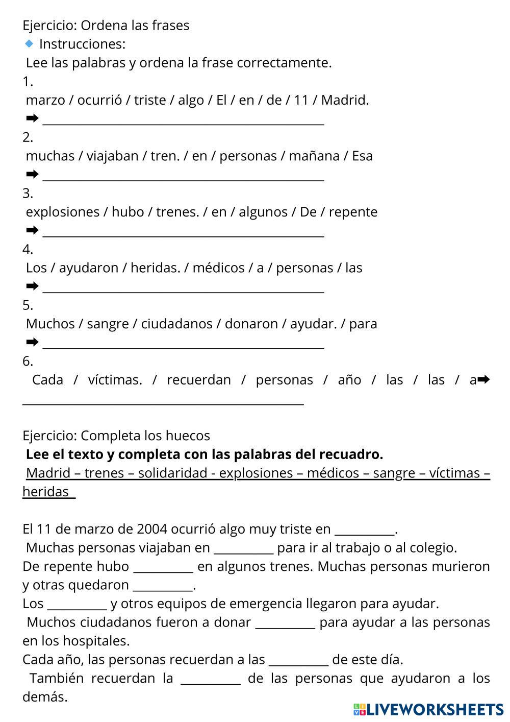Created by mf2796 ESL Spanish A2 Reading Spanish Author's Instructions Lee el texto y sigue las instrucciones de cada ejercicio. My Google Classroom Courses × 0 classes selected (0 students total) Quick Access Select all classes (0 classes) All Classes Loading courses... Cancel Share Share to selected Course __COURSE_NAME__ __STUDENT_NAME__ (__STUDENT_EMAIL__) LECTURA 11 MARZO Download Worksheet Validation Check my answers Emails my answers to my teacher Full name Group/level School subject Teacher's email or key code Close Submit Validating worksheet... (12) Your answers have been sent to your teacher. Good luck! OK We encountered an error submitting your answers. Please try again. OK Advertisement | Go Ad Free Created by mf2796 ESL Spanish A2 Reading Spanish Author's Instructions Lee el texto y sigue las instrucciones de cada ejercicio. Explore Worksheets Por soñar ESL A2 Por soñar Reading - ESL Lee el texto y responde a las preguntas USO DE LA B y V ESL A2 USO DE LA B y V Reading - ESL Completa con la grafía B y la V donde corresponda. El pozo ESL A2 El pozo Reading - ESL Luego de la lectura compartida respondemos... Travel ESL A2 Travel Reading - ESL Read the text then answer the questions