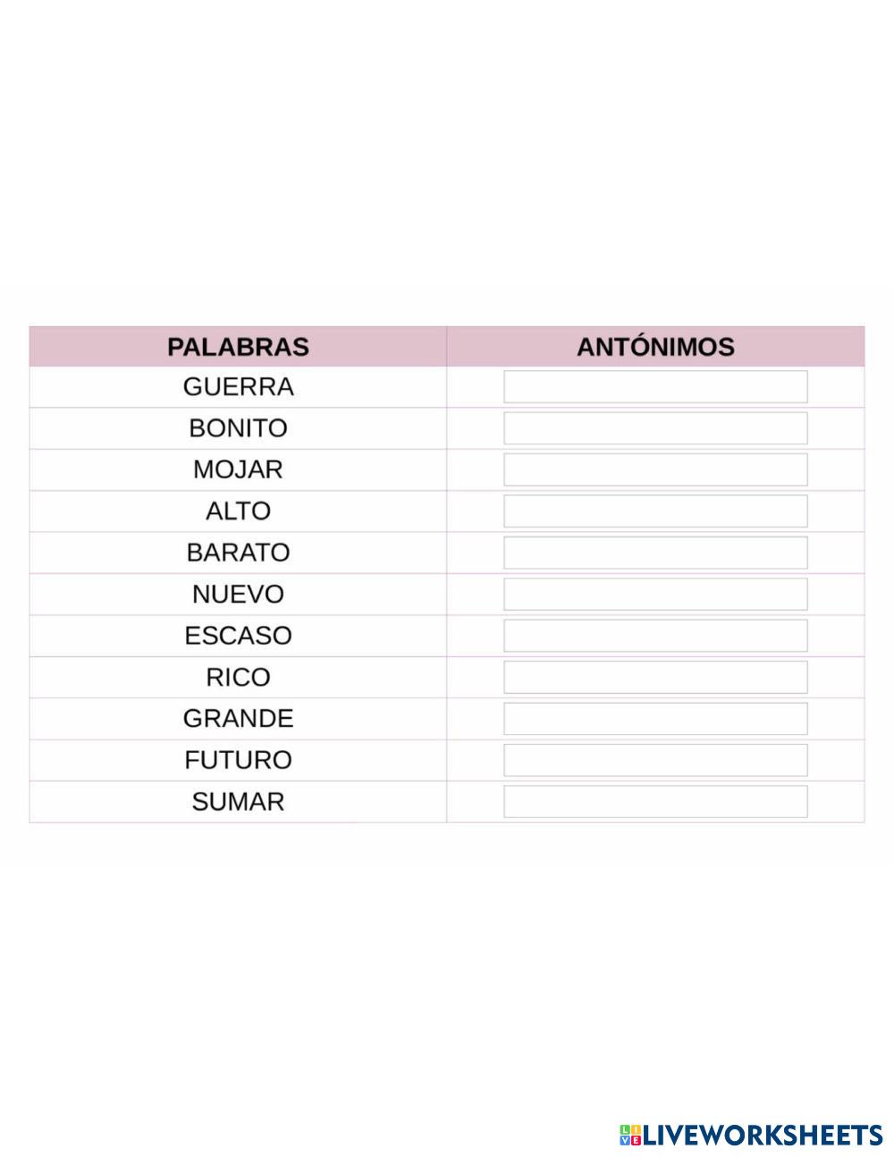 Created byPatzun1 ESL Spanish A2-Elementary Vocabulary Spanish Author's Instructions EJERCICIO 4 My Google Classroom Courses × 0 classes selected (0 students total) Quick Access Select all classes (0 classes) All Classes Loading courses... Cancel Share Share to selected Course __COURSE_NAME__ __STUDENT_NAME__ (__STUDENT_EMAIL__) EJERCICIO 4 Download Worksheet Validation Check my answers Emails my answers to my teacher Full name Group/level School subject Teacher's email or key code Close Submit Validating worksheet... (12) Your answers have been sent to your teacher. Good luck! OK We encountered an error submitting your answers. Please try again. OK Advertisement | Go Ad Free Created byPatzun1 ESL Spanish A2-Elementary Vocabulary Spanish Author's Instructions EJERCICIO 4 Explore Worksheets numeros del 11-20 ESL A2-Elementary numeros del 11-20 Vocabulary - ESL Drag and drop the correct number to the number word. Sinónimos y Antónimos ESL A2-Elementary Sinónimos y Antónimos Vocabulary - ESL Sinónimos y Antónimos Irregular verbs 01 ESL A2-Elementary Irregular verbs 01 Vocabulary - ESL Complete the blanks 2º ESO Unit 1 Test ESL A2-Elementary 2º ESO Unit 1 Test Vocabulary - ESL Unit 1 Test Grammar, Vocabulary, Reading and Listening