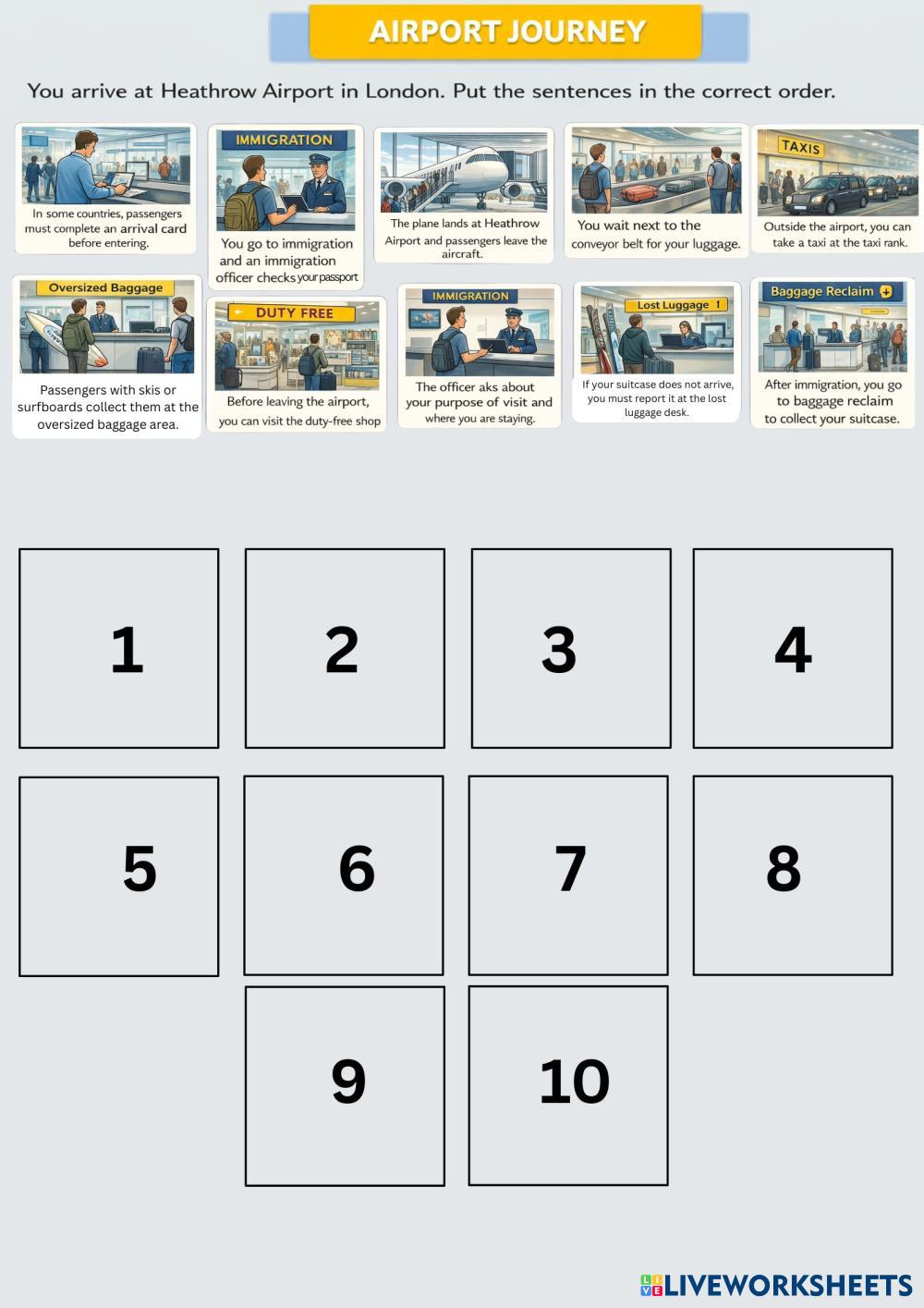 Put the airport journey in the correct order. Drag each step into boxes 1–10.