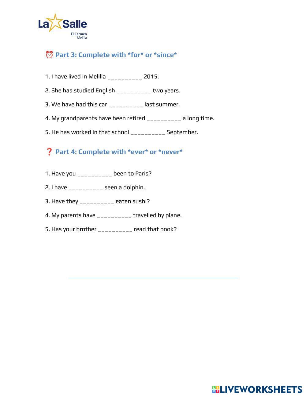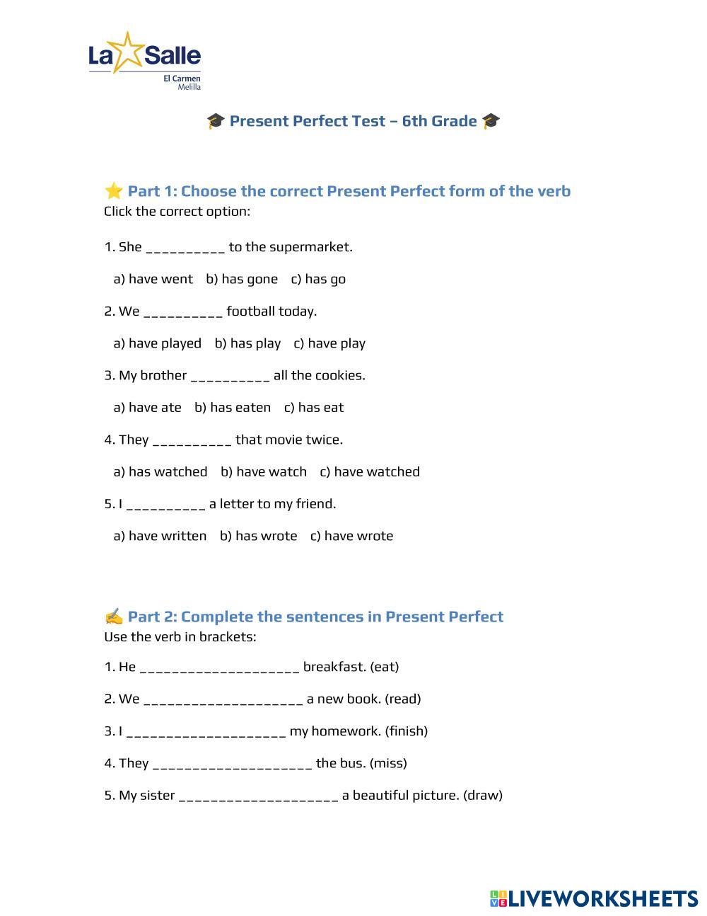 Created by LuciaBN ESL English A2-Elementary Writing Spanish Author's Instructions PRESNT PERFECT My Google Classroom Courses × 0 classes selected (0 students total) Quick Access Select all classes (0 classes) All Classes Loading courses... Cancel Share Share to selected Course __COURSE_NAME__ __STUDENT_NAME__ (__STUDENT_EMAIL__) PRESENTE PERFECT Download Worksheet Validation Check my answers Emails my answers to my teacher Full name Group/level School subject Teacher's email or key code Close Submit Validating worksheet... (12) Your answers have been sent to your teacher. Good luck! OK We encountered an error submitting your answers. Please try again. OK Advertisement | Go Ad Free Created by LuciaBN ESL English A2-Elementary Writing Spanish Author's Instructions PRESNT PERFECT Explore Worksheets R&W - F2 - T1 - PART - VII ESL A2-Elementary R&W - F2 - T1 - PART - VII Writing - ESL R&W R&W - F14 - P-VI ESL A2-Elementary R&W - F14 - P-VI Writing - ESL R&W R&W - F13 - P-VI ESL A2-Elementary R&W - F13 - P-VI Writing - ESL R&W R&W - F12 - P-VI ESL A2-Elementary R&W - F12 - P-VI Writing - ESL R&W