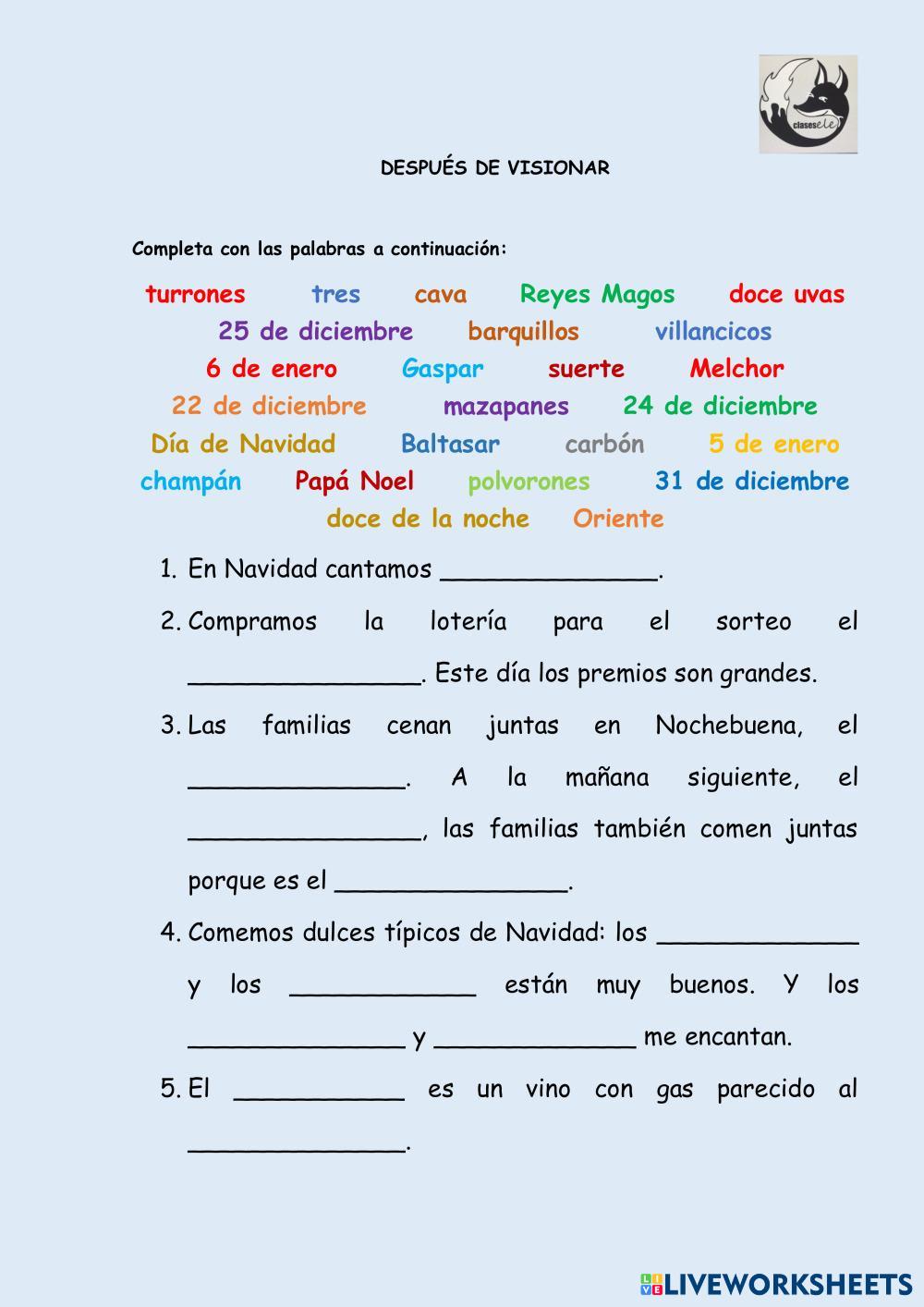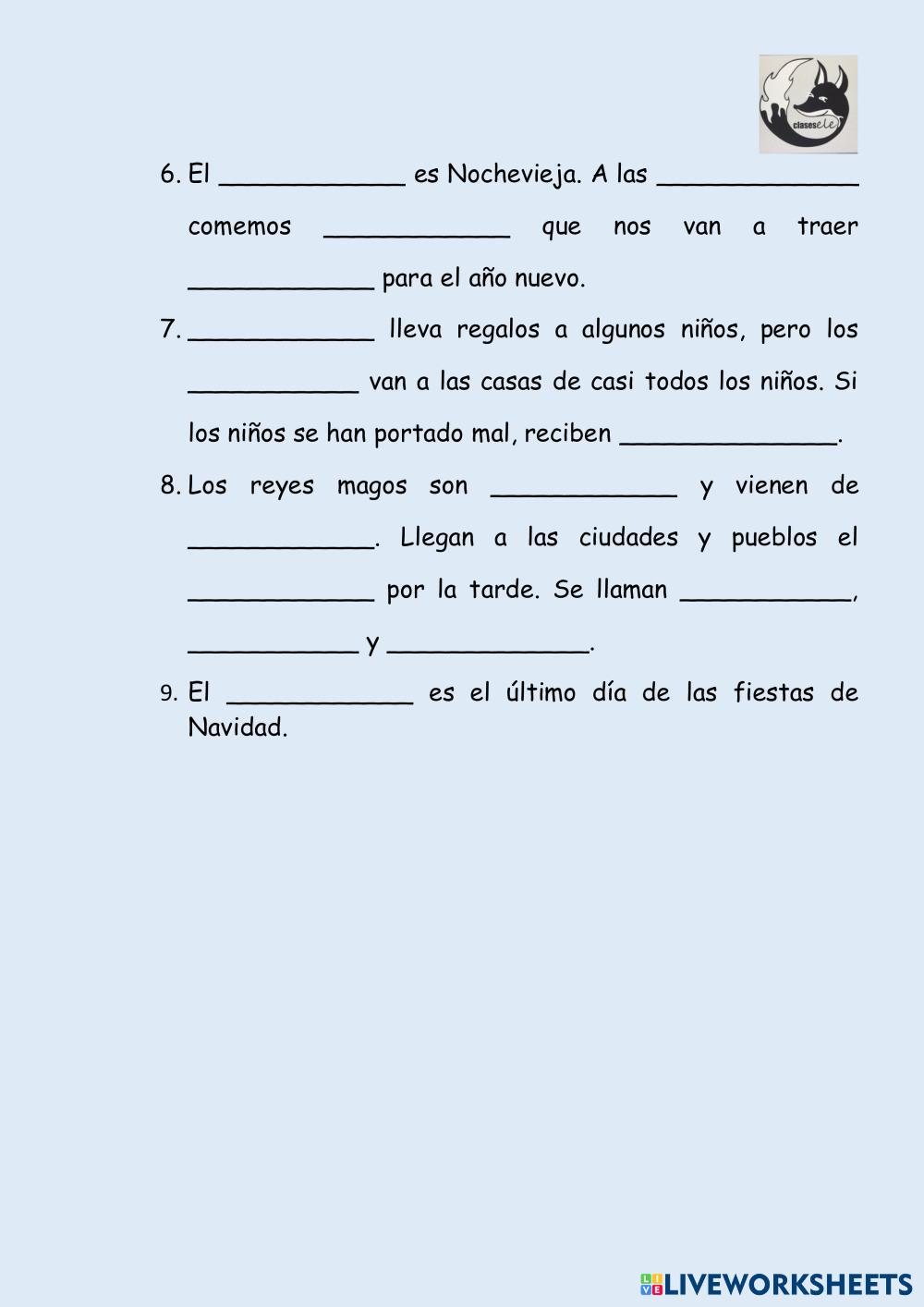 Created by clasesele Español como Lengua Extranjera (ELE) Fiestas y tradiciones Age 10+ level: elemental Spanish Author's Instructions My Google Classroom Courses × 0 classes selected (0 students total) Quick Access Select all classes (0 classes) All Classes Loading courses... Cancel Share Share to selected Course __COURSE_NAME__ __STUDENT_NAME__ (__STUDENT_EMAIL__) Feliz Navidad Download Worksheet Validation Check my answers Emails my answers to my teacher Full name Group/level School subject Teacher's email or key code Close Submit Validating worksheet... (12) Your answers have been sent to your teacher. Good luck! OK We encountered an error submitting your answers. Please try again. OK Advertisement | Go Ad Free Created by clasesele Español como Lengua Extranjera (ELE) Fiestas y tradiciones Age 10+ level: elemental Spanish Author's Instructions