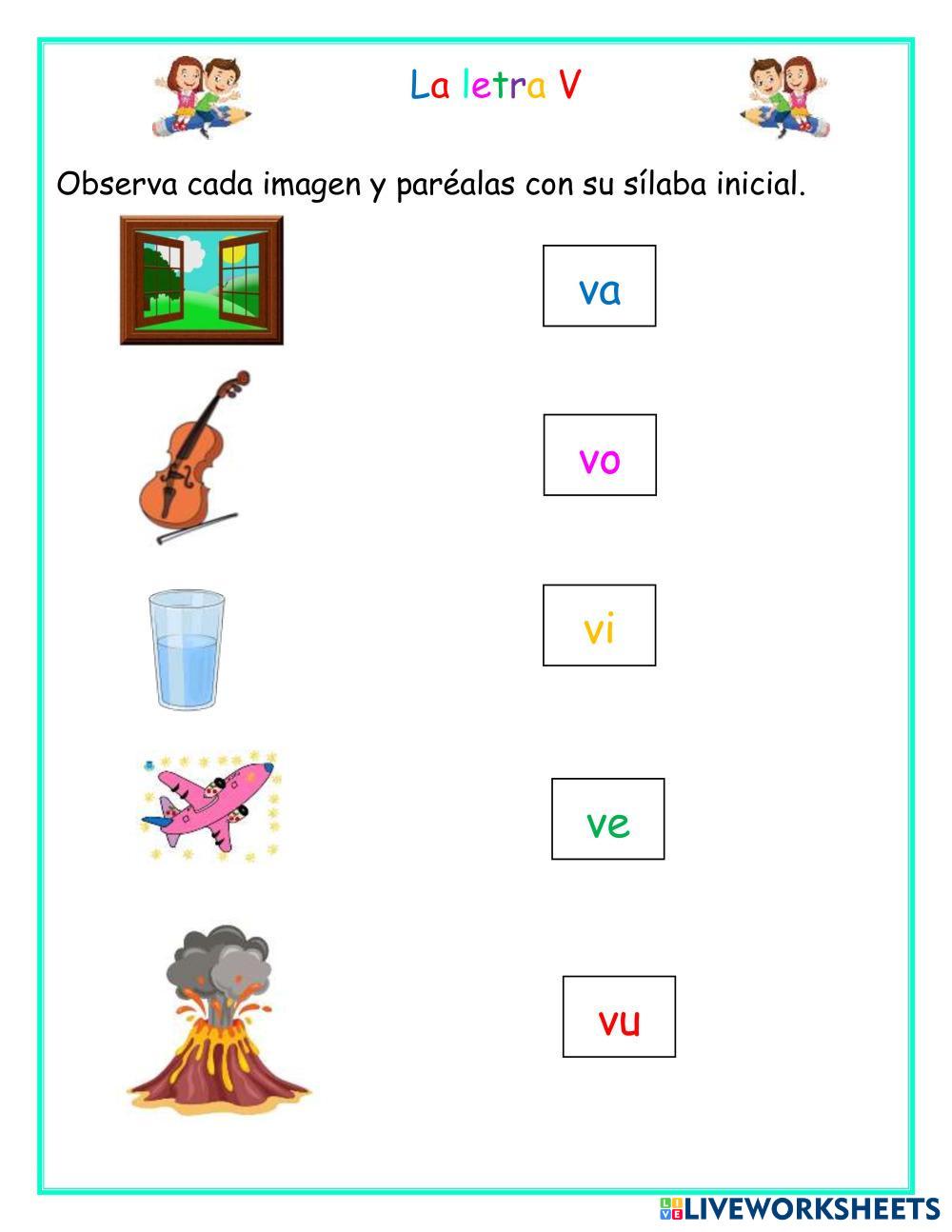 Created byMarlinee Batiz Español. Español Age 4-8 level: Kinder Spanish Author's Instructions Parea cada imagen con su sílaba inicial. My Google Classroom Courses × 0 classes selected (0 students total) Quick Access Select all classes (0 classes) All Classes Loading courses... Cancel Share Share to selected Course __COURSE_NAME__ __STUDENT_NAME__ (__STUDENT_EMAIL__) La letra V Download Worksheet Validation Check my answers Emails my answers to my teacher Full name Group/level School subject Teacher's email or key code Close Submit Validating worksheet... (12) Your answers have been sent to your teacher. Good luck! OK We encountered an error submitting your answers. Please try again. OK Advertisement | Go Ad Free Created byMarlinee Batiz Español. Español Age 4-8 level: Kinder Spanish Author's Instructions Parea cada imagen con su sílaba inicial.