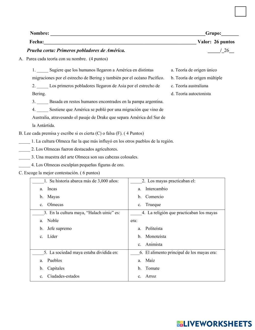 Created byAbigail Batista Estudios Sociales Los primeros pobladores de América Age 10-14 level: Quinto grado Spanish Author's Instructions My Google Classroom Courses × 0 classes selected (0 students total) Quick Access Select all classes (0 classes) All Classes Loading courses... Cancel Share Share to selected Course __COURSE_NAME__ __STUDENT_NAME__ (__STUDENT_EMAIL__) Prueba corta: Primeros pobladores de América Download Worksheet Validation Check my answers Emails my answers to my teacher Full name Group/level School subject Teacher's email or key code Close Submit Validating worksheet... (12) Your answers have been sent to your teacher. Good luck! OK We encountered an error submitting your answers. Please try again. OK Advertisement | Go Ad Free Created byAbigail Batista Estudios Sociales Los primeros pobladores de América Age 10-14 level: Quinto grado Spanish Author's Instructions