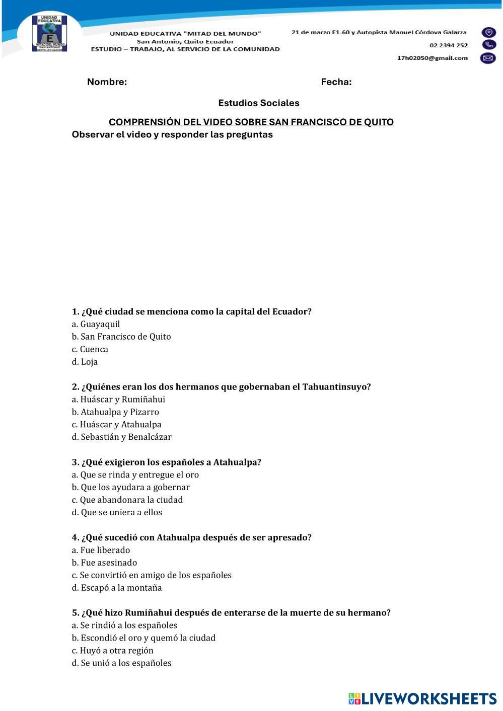 Created byMonilú Estudios Sociales Historia de Quito Age 8-14 level: CUARTO GRADO Spanish Author's Instructions My Google Classroom Courses × 0 classes selected (0 students total) Quick Access Select all classes (0 classes) All Classes Loading courses... Cancel Share Share to selected Course __COURSE_NAME__ __STUDENT_NAME__ (__STUDENT_EMAIL__) COMPRENSIÓN DEL VIDEO SOBRE SAN FRANCISCO DE QUITO Download Worksheet Validation Check my answers Emails my answers to my teacher Full name Group/level School subject Teacher's email or key code Close Submit Validating worksheet... (12) Your answers have been sent to your teacher. Good luck! OK We encountered an error submitting your answers. Please try again. OK Advertisement | Go Ad Free Created byMonilú Estudios Sociales Historia de Quito Age 8-14 level: CUARTO GRADO Spanish Author's Instructions