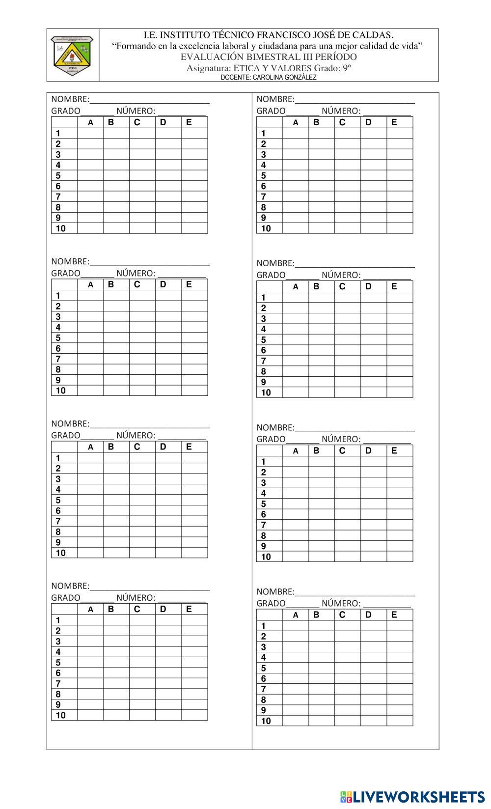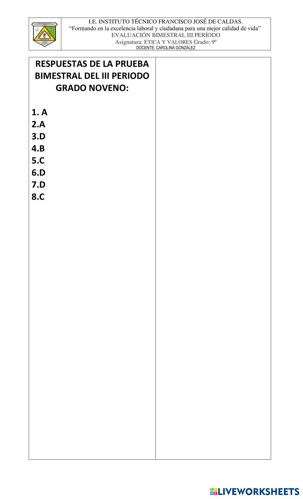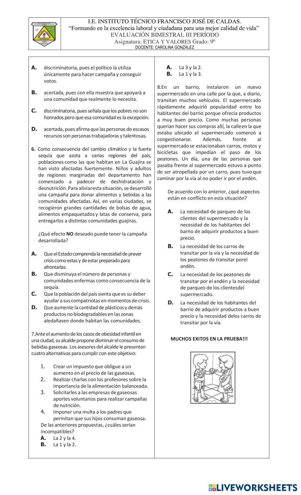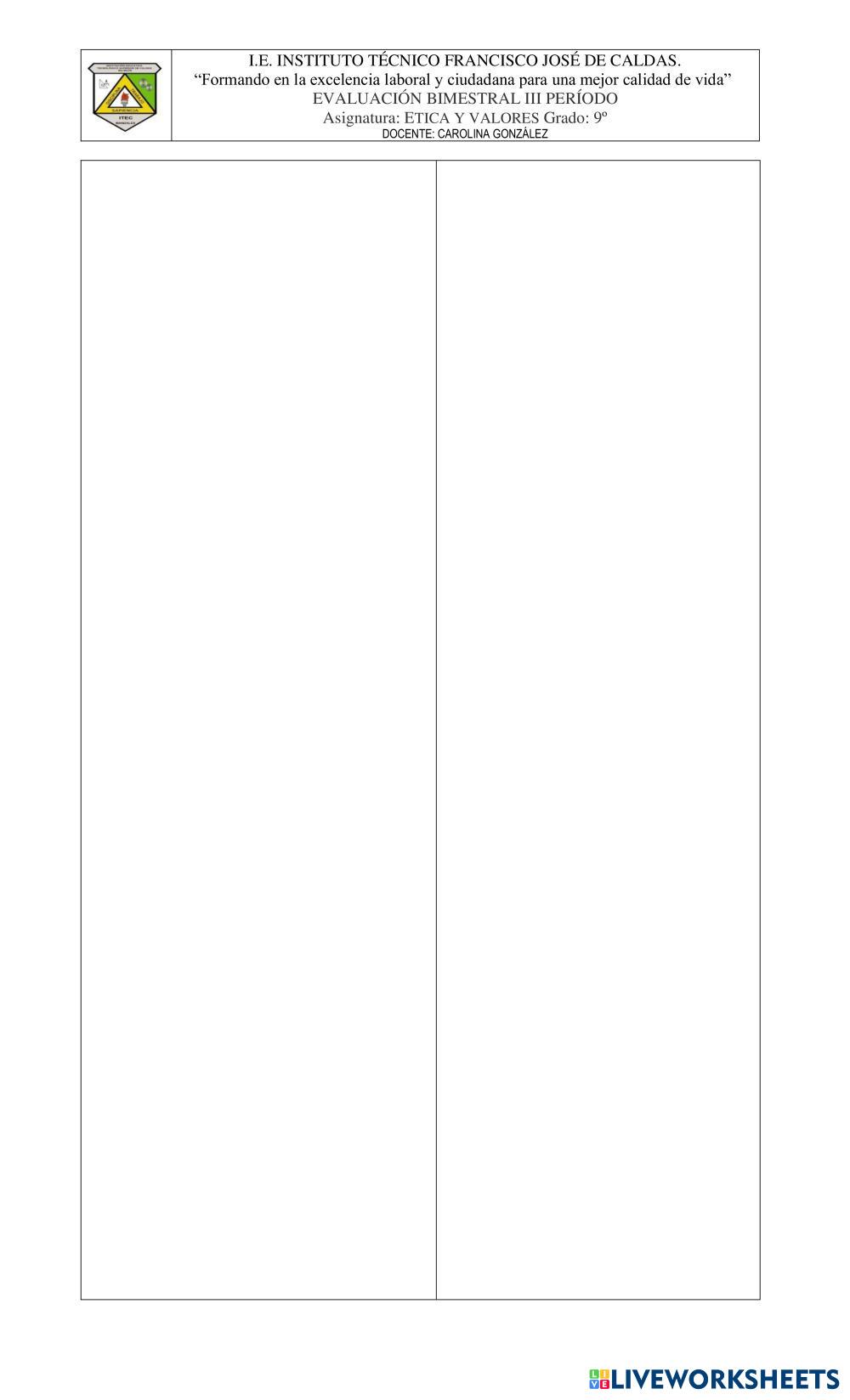 Created byAlvaro Munoz ethics values Age 13 level: 9 Spanish Author's Instructions My Google Classroom Courses × 0 classes selected (0 students total) Quick Access Select all classes (0 classes) All Classes Loading courses... Cancel Share Share to selected Course __COURSE_NAME__ __STUDENT_NAME__ (__STUDENT_EMAIL__) bimestral ética tercer periodo Download Worksheet Validation Check my answers Emails my answers to my teacher Full name Group/level School subject Teacher's email or key code Close Submit Validating worksheet... (12) Your answers have been sent to your teacher. Good luck! OK We encountered an error submitting your answers. Please try again. OK Advertisement | Go Ad Free Created byAlvaro Munoz ethics values Age 13 level: 9 Spanish Author's Instructions