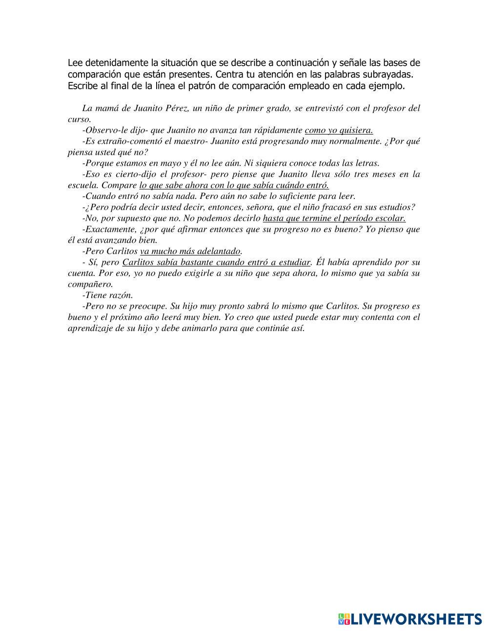 Created byALEJANDRA MARQUEZ Evaluación pedagógica Bases de comparación Age 18+ level: Universitario Spanish Author's Instructions My Google Classroom Courses × 0 classes selected (0 students total) Quick Access Select all classes (0 classes) All Classes Loading courses... Cancel Share Share to selected Course __COURSE_NAME__ __STUDENT_NAME__ (__STUDENT_EMAIL__) Bases de Comparación en la Evaluación Download Worksheet Validation Check my answers Emails my answers to my teacher Full name Group/level School subject Teacher's email or key code Close Submit Validating worksheet... (12) Your answers have been sent to your teacher. Good luck! OK We encountered an error submitting your answers. Please try again. OK Advertisement | Go Ad Free Created byALEJANDRA MARQUEZ Evaluación pedagógica Bases de comparación Age 18+ level: Universitario Spanish Author's Instructions
