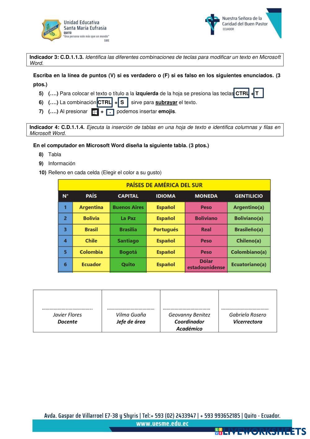 Created byJavier Flores C. examen SEMESTRAL Age 8-11 level: 7 Spanish Author's Instructions My Google Classroom Courses × 0 classes selected (0 students total) Quick Access Select all classes (0 classes) All Classes Loading courses... Cancel Share Share to selected Course __COURSE_NAME__ __STUDENT_NAME__ (__STUDENT_EMAIL__) EXAMEN COMPETENCIAS DIGITALES 7MO EGB Download Worksheet Validation Check my answers Emails my answers to my teacher Full name Group/level School subject Teacher's email or key code Close Submit Validating worksheet... (12) Your answers have been sent to your teacher. Good luck! OK We encountered an error submitting your answers. Please try again. OK Advertisement | Go Ad Free Created byJavier Flores C. examen SEMESTRAL Age 8-11 level: 7 Spanish Author's Instructions