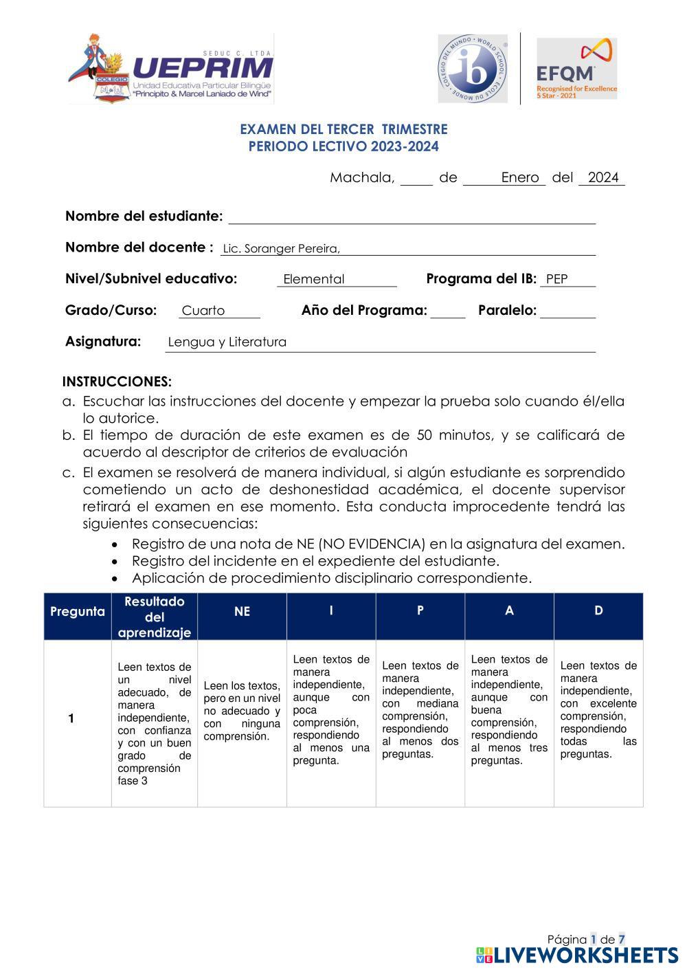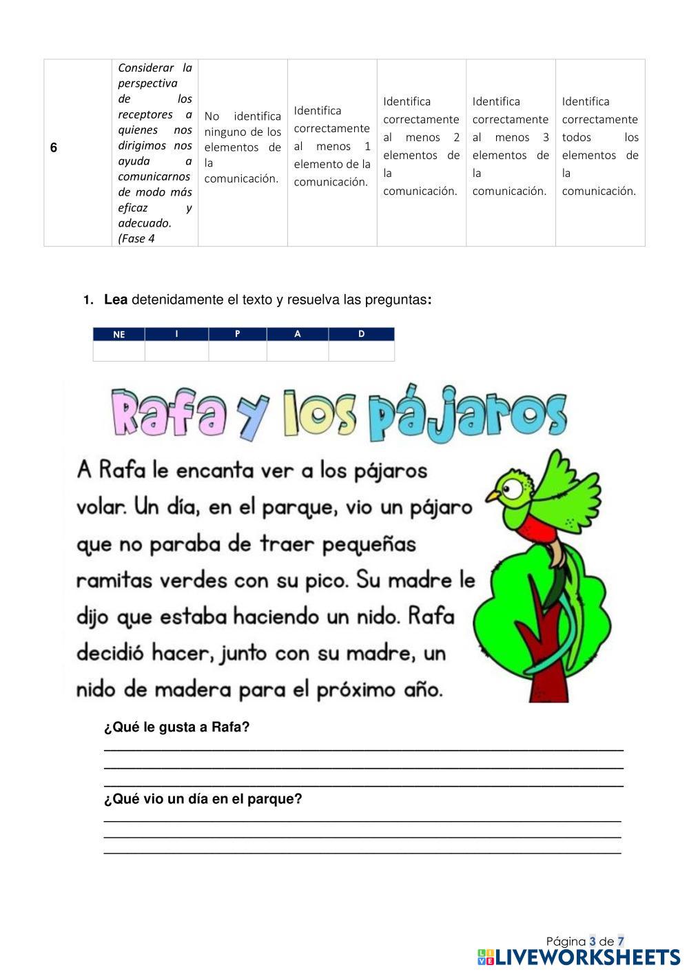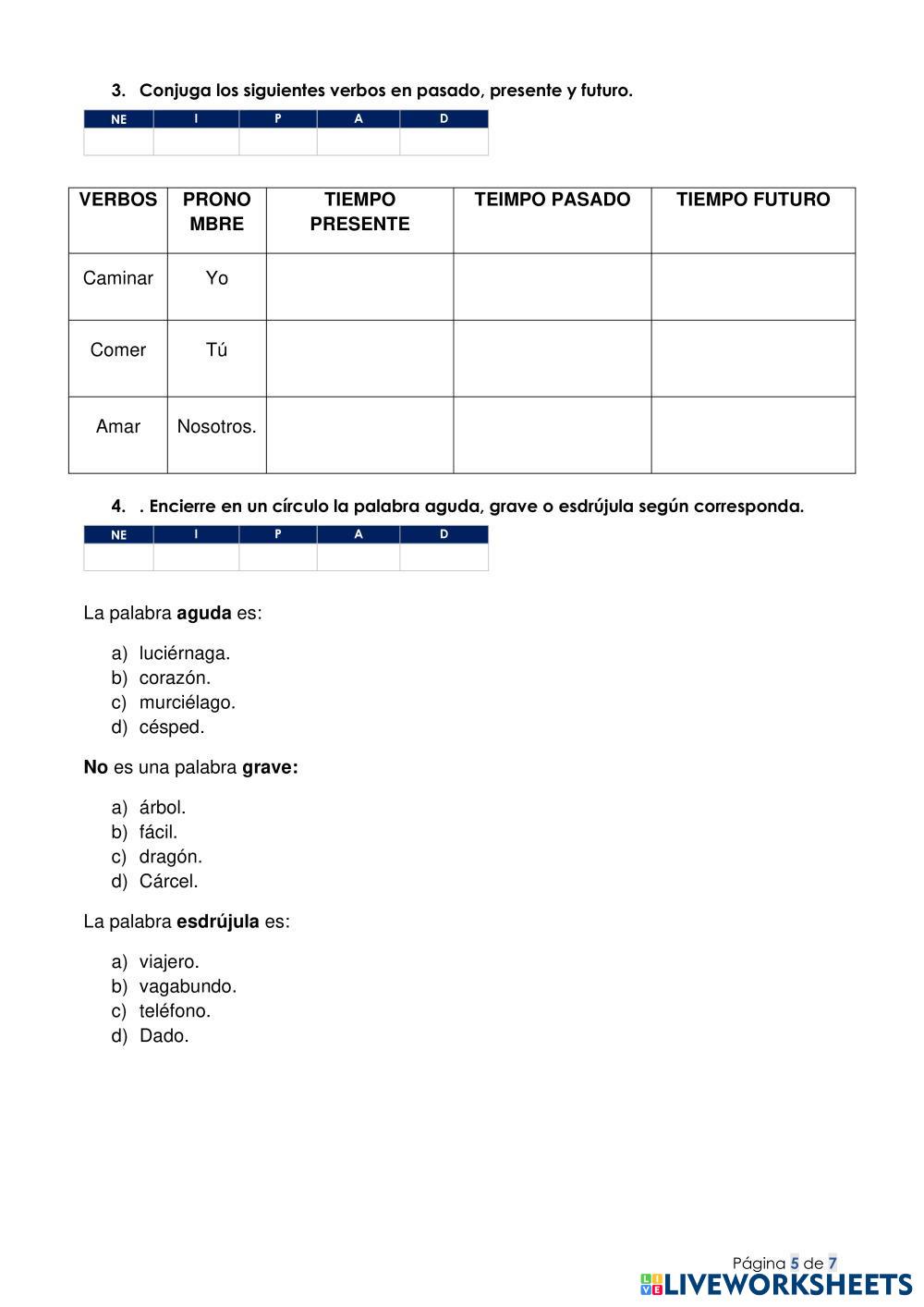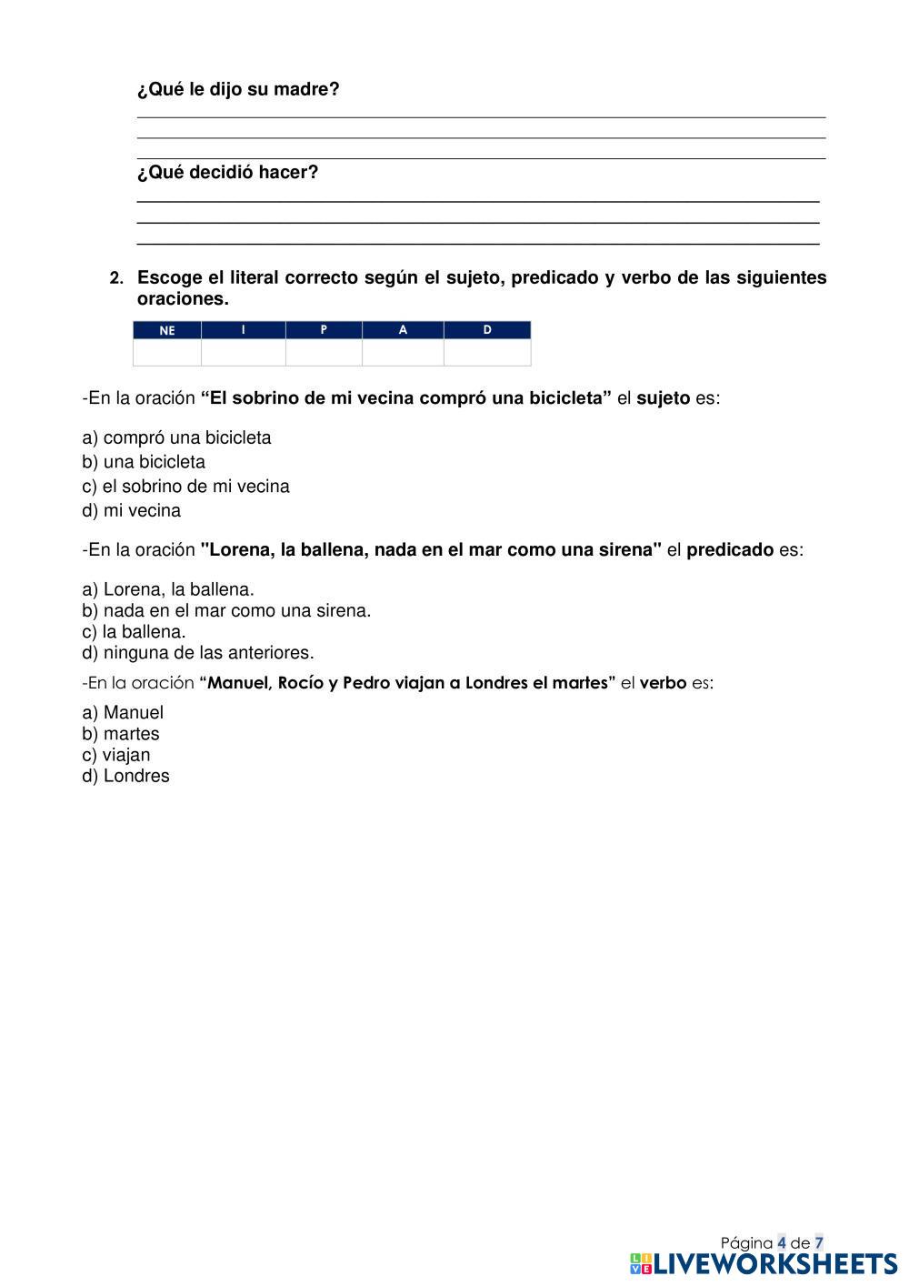 Created bySoranger Anabel Pereira Vargas EXAMENES VIRTUALES Comprensión lectora, reglas de acentuación, oraciones sujeto y predicado, verbo Age 8-14 level: 4to Spanish Author's Instructions My Google Classroom Courses × 0 classes selected (0 students total) Quick Access Select all classes (0 classes) All Classes Loading courses... Cancel Share Share to selected Course __COURSE_NAME__ __STUDENT_NAME__ (__STUDENT_EMAIL__) Examen de lengua y literatura diferenciado Download Worksheet Validation Check my answers Emails my answers to my teacher Full name Group/level School subject Teacher's email or key code Close Submit Validating worksheet... (12) Your answers have been sent to your teacher. Good luck! OK We encountered an error submitting your answers. Please try again. OK Advertisement | Go Ad Free Created bySoranger Anabel Pereira Vargas EXAMENES VIRTUALES Comprensión lectora, reglas de acentuación, oraciones sujeto y predicado, verbo Age 8-14 level: 4to Spanish Author's Instructions