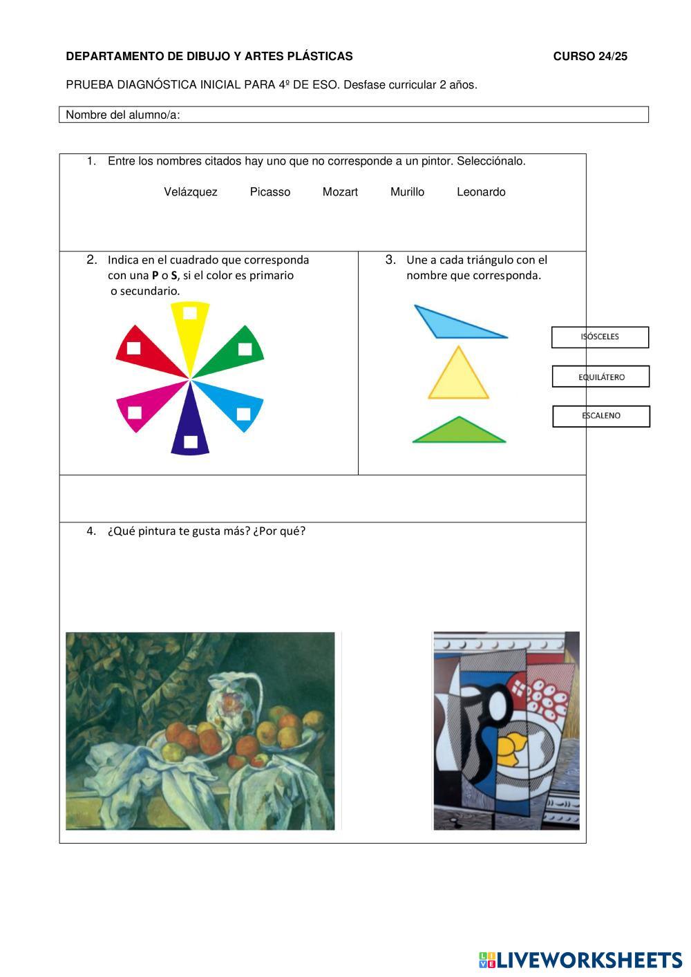 Created byJesus Rodríguez Morales EXPRESION ARTISTICA Expresion artistica Age 12-16 level: medio Spanish Author's Instructions My Google Classroom Courses × 0 classes selected (0 students total) Quick Access Select all classes (0 classes) All Classes Loading courses... Cancel Share Share to selected Course __COURSE_NAME__ __STUDENT_NAME__ (__STUDENT_EMAIL__) Ficha 2 Download Worksheet Validation Check my answers Emails my answers to my teacher Full name Group/level School subject Teacher's email or key code Close Submit Validating worksheet... (12) Your answers have been sent to your teacher. Good luck! OK We encountered an error submitting your answers. Please try again. OK Advertisement | Go Ad Free Created byJesus Rodríguez Morales EXPRESION ARTISTICA Expresion artistica Age 12-16 level: medio Spanish Author's Instructions