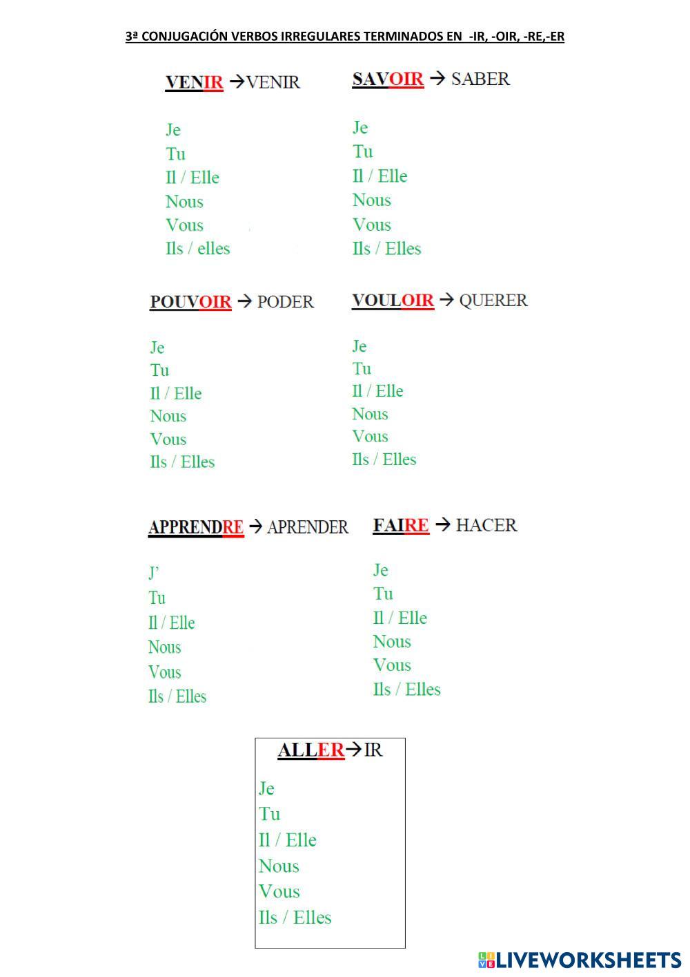 Created byAntonio frances verbos verbos frances Age 10+ level: 6º primaria Spanish Author's Instructions My Google Classroom Courses × 0 classes selected (0 students total) Quick Access Select all classes (0 classes) All Classes Loading courses... Cancel Share Share to selected Course __COURSE_NAME__ __STUDENT_NAME__ (__STUDENT_EMAIL__) verbos irregulares 3ª conjugación francés Download Worksheet Validation Check my answers Emails my answers to my teacher Full name Group/level School subject Teacher's email or key code Close Submit Validating worksheet... (12) Your answers have been sent to your teacher. Good luck! OK We encountered an error submitting your answers. Please try again. OK Advertisement | Go Ad Free Created byAntonio frances verbos verbos frances Age 10+ level: 6º primaria Spanish Author's Instructions