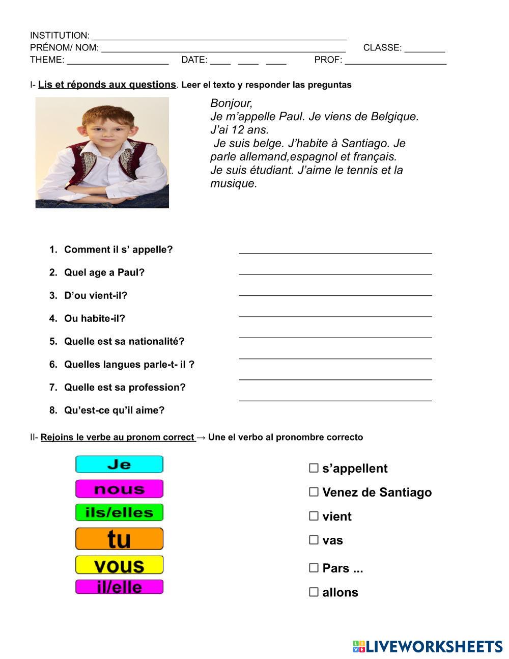 Je m’appelle Paul. Je viens de Belgique. J’ai 12 ans.