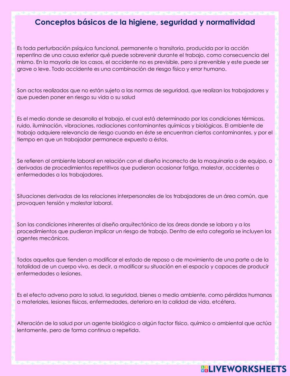 Created byAriana Suárez Díaz Higiene y seguridad en el trabajo higiene Age 18+ level: 5 Spanish Author's Instructions My Google Classroom Courses × 0 classes selected (0 students total) Quick Access Select all classes (0 classes) All Classes Loading courses... Cancel Share Share to selected Course __COURSE_NAME__ __STUDENT_NAME__ (__STUDENT_EMAIL__) Higiene y seguridad en el trabajo Download Worksheet Validation Check my answers Emails my answers to my teacher Full name Group/level School subject Teacher's email or key code Close Submit Validating worksheet... (12) Your answers have been sent to your teacher. Good luck! OK We encountered an error submitting your answers. Please try again. OK Advertisement | Go Ad Free Created byAriana Suárez Díaz Higiene y seguridad en el trabajo higiene Age 18+ level: 5 Spanish Author's Instructions