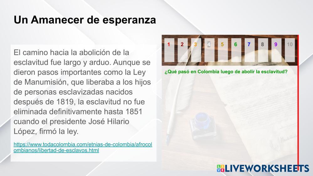 Created by Maneuser Historia de Colombia Esclavitud Age 13+ level: 8° Spanish Author's Instructions My Google Classroom Courses × 0 classes selected (0 students total) Quick Access Select all classes (0 classes) All Classes Loading courses... Cancel Share Share to selected Course __COURSE_NAME__ __STUDENT_NAME__ (__STUDENT_EMAIL__) 06.Un Amanecer de esperanza Download Worksheet Validation Check my answers Emails my answers to my teacher Full name Group/level School subject Teacher's email or key code Close Submit Validating worksheet... (12) Your answers have been sent to your teacher. Good luck! OK We encountered an error submitting your answers. Please try again. OK Advertisement | Go Ad Free Created by Maneuser Historia de Colombia Esclavitud Age 13+ level: 8° Spanish Author's Instructions