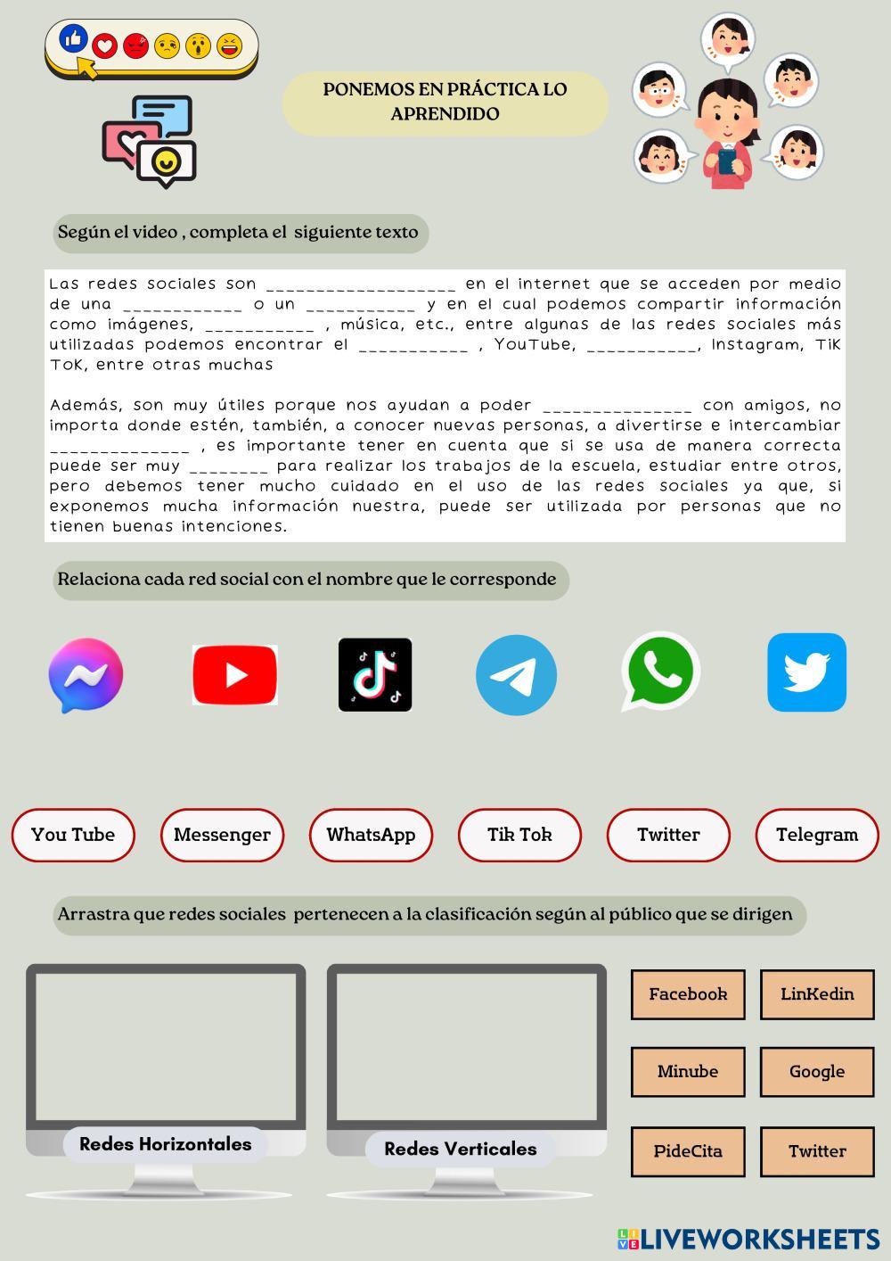 Created byMercedes_Concha_Layme INFORMATICA EDUCATIVA Ficha - Redes Sociales Age 12+ level: secundaria Spanish Author's Instructions My Google Classroom Courses × 0 classes selected (0 students total) Quick Access Select all classes (0 classes) All Classes Loading courses... Cancel Share Share to selected Course __COURSE_NAME__ __STUDENT_NAME__ (__STUDENT_EMAIL__) Ficha - Redes Sociales Download Worksheet Validation Check my answers Emails my answers to my teacher Full name Group/level School subject Teacher's email or key code Close Submit Validating worksheet... (12) Your answers have been sent to your teacher. Good luck! OK We encountered an error submitting your answers. Please try again. OK Advertisement | Go Ad Free Created byMercedes_Concha_Layme INFORMATICA EDUCATIVA Ficha - Redes Sociales Age 12+ level: secundaria Spanish Author's Instructions