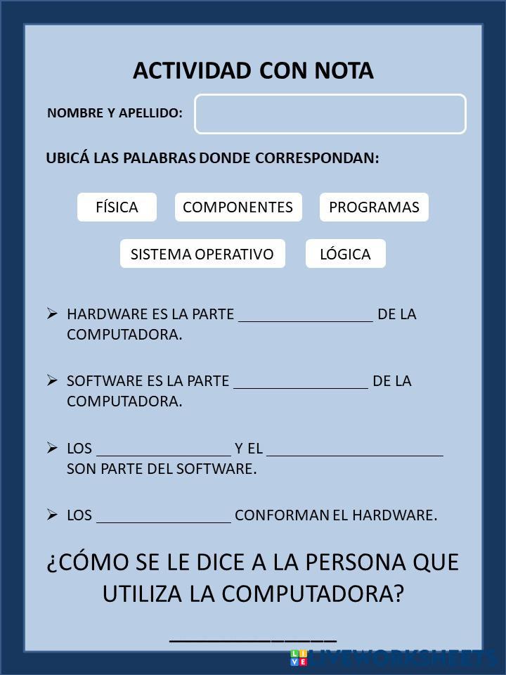 Created byFernando Informática Componentes de la Computadora Age 8+ level: Primaria Spanish Author's Instructions My Google Classroom Courses × 0 classes selected (0 students total) Quick Access Select all classes (0 classes) All Classes Loading courses... Cancel Share Share to selected Course __COURSE_NAME__ __STUDENT_NAME__ (__STUDENT_EMAIL__) Actividad con nota INFORMÁTICA Download Worksheet Validation Check my answers Emails my answers to my teacher Full name Group/level School subject Teacher's email or key code Close Submit Validating worksheet... (12) Your answers have been sent to your teacher. Good luck! OK We encountered an error submitting your answers. Please try again. OK Advertisement | Go Ad Free Created byFernando Informática Componentes de la Computadora Age 8+ level: Primaria Spanish Author's Instructions