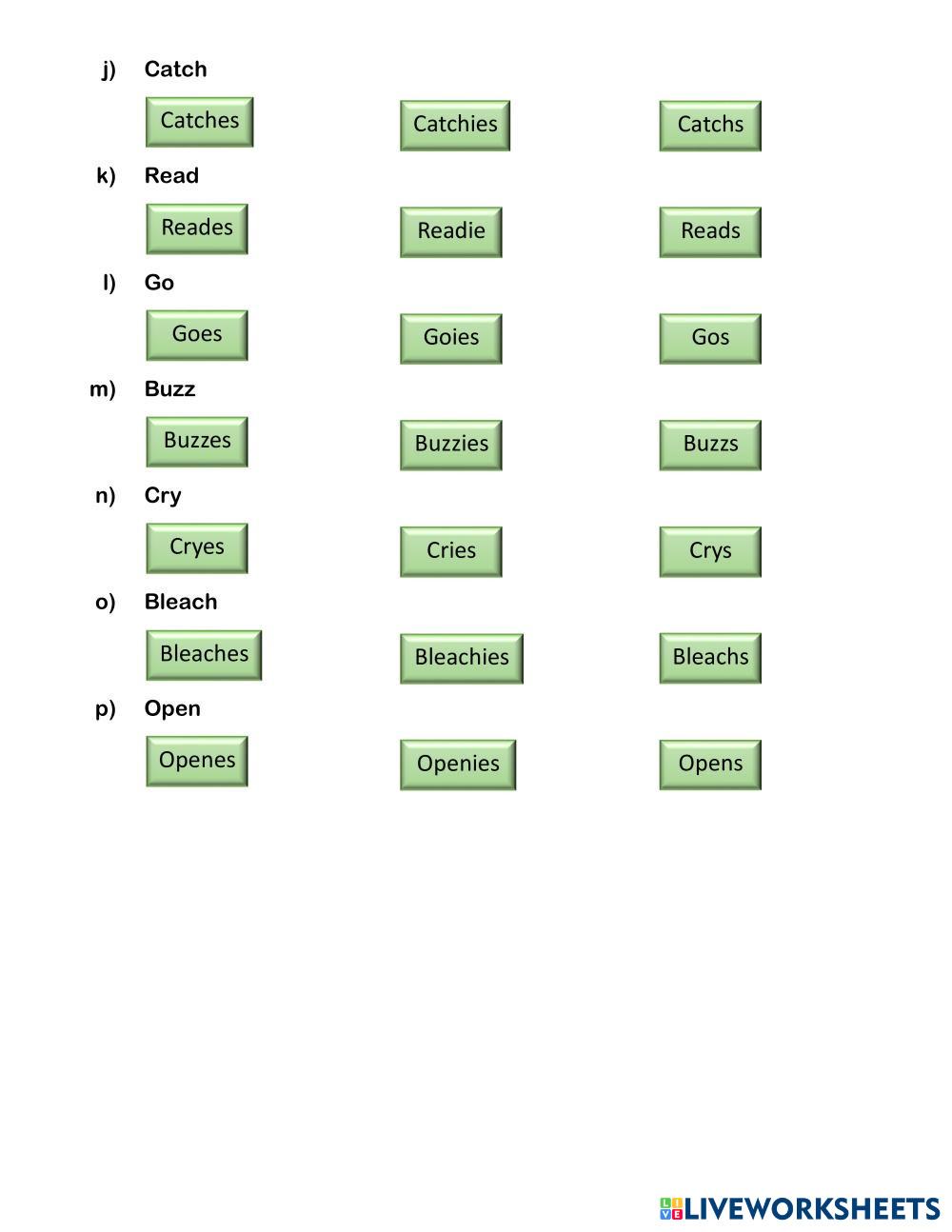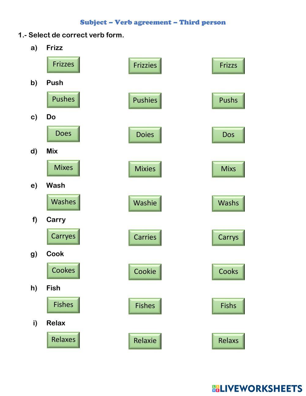Created byJanira López Inglés Concordancia verbal Age 9 level: 7 EGB Spanish Author's Instructions My Google Classroom Courses × 0 classes selected (0 students total) Quick Access Select all classes (0 classes) All Classes Loading courses... Cancel Share Share to selected Course __COURSE_NAME__ __STUDENT_NAME__ (__STUDENT_EMAIL__) SUBJECT - VERB AGREEMENT Download Worksheet Validation Check my answers Emails my answers to my teacher Full name Group/level School subject Teacher's email or key code Close Submit Validating worksheet... (12) Your answers have been sent to your teacher. Good luck! OK We encountered an error submitting your answers. Please try again. OK Advertisement | Go Ad Free Created byJanira López Inglés Concordancia verbal Age 9 level: 7 EGB Spanish Author's Instructions