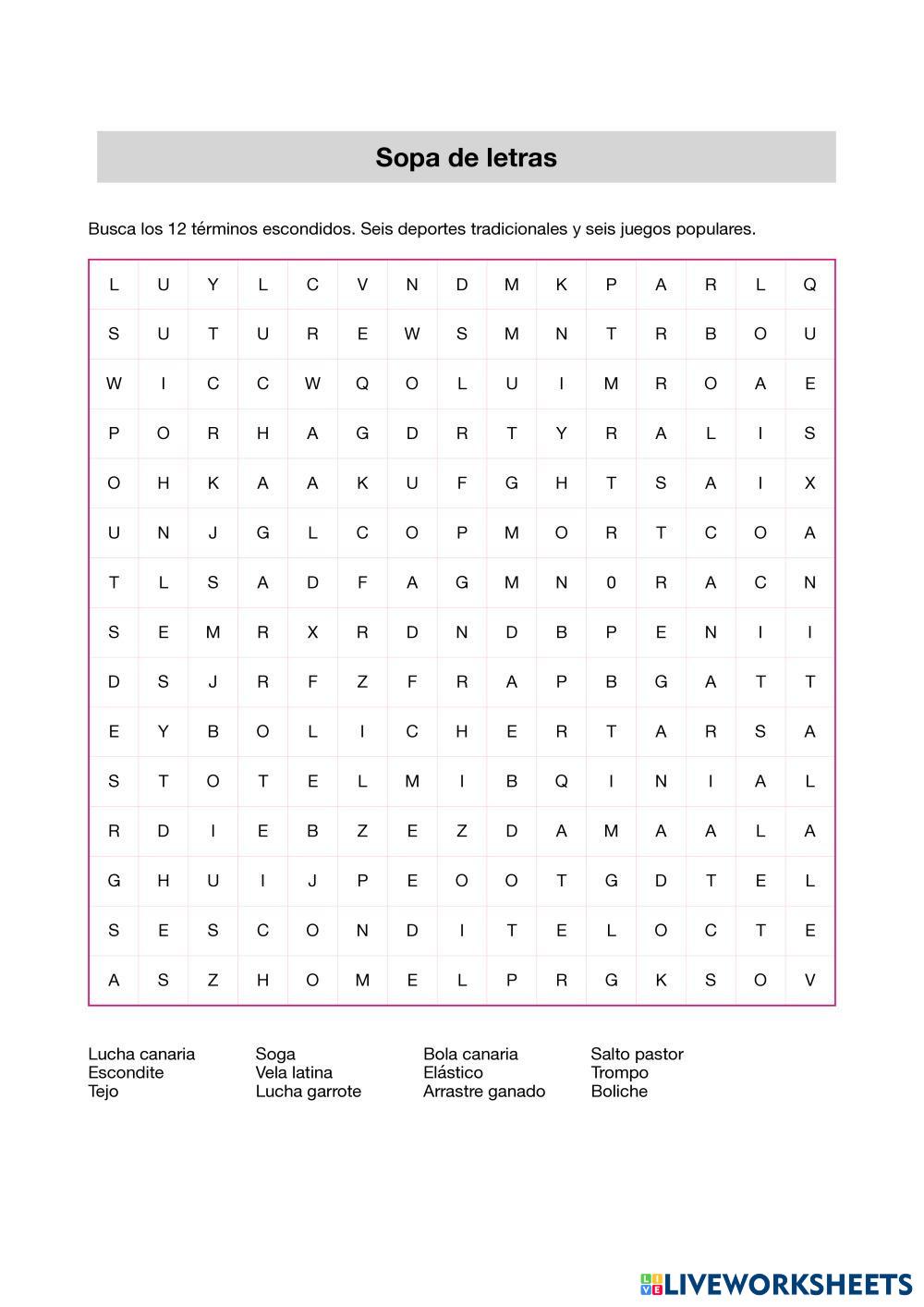 Buscar las 12 palabras ocultas al pie de ficha. Seis corresponden a deportes tradicionales y otras seis a juegos populares. Escribe debajo las palabras encontradas.