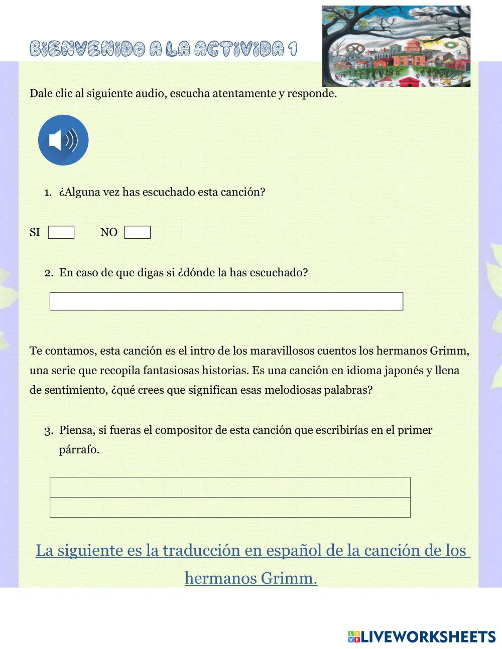La actividad está relacionada con la canción de los cuentos de los hermanos Grimm. Se realiza un análisis de la letra y evalúa la comprensión lectora.