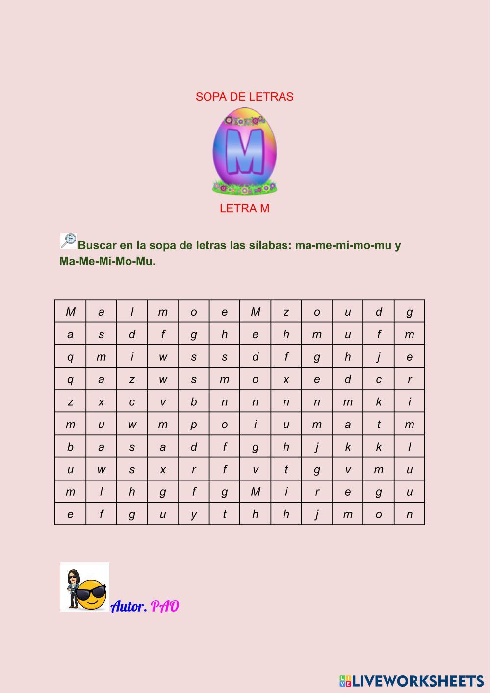 Buscar en la sopa de letras las sílabas: ma-me-mi-mo-mu; Ma-Me-Mi-Mo-Mu.