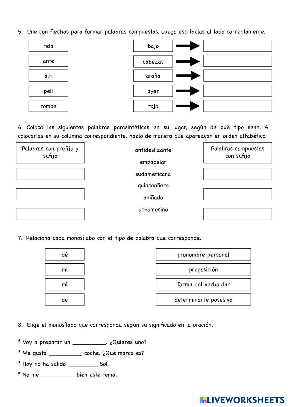 En esta ficha se trabajan las Siete Maravillas del Mundo Antiguo, palabras compuestas y parasintéticas, determinantes artículos, demostrativos y posesivos y los monosílabos con y sin tilde (tilde diacrítica).