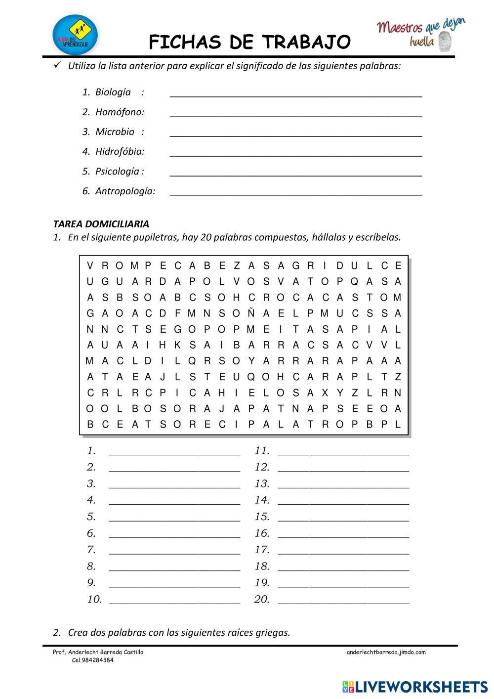 Created byArnau Cancer Domene Lengua Castellana Formación de palabras Age 11-16 level: 2º ESO Spanish Author's Instructions My Google Classroom Courses × 0 classes selected (0 students total) Quick Access Select all classes (0 classes) All Classes Loading courses... Cancel Share Share to selected Course __COURSE_NAME__ __STUDENT_NAME__ (__STUDENT_EMAIL__) Formación de las palabras Download Worksheet Validation Check my answers Emails my answers to my teacher Full name Group/level School subject Teacher's email or key code Close Submit Validating worksheet... (12) Your answers have been sent to your teacher. Good luck! OK We encountered an error submitting your answers. Please try again. OK Advertisement | Go Ad Free Created byArnau Cancer Domene Lengua Castellana Formación de palabras Age 11-16 level: 2º ESO Spanish Author's Instructions