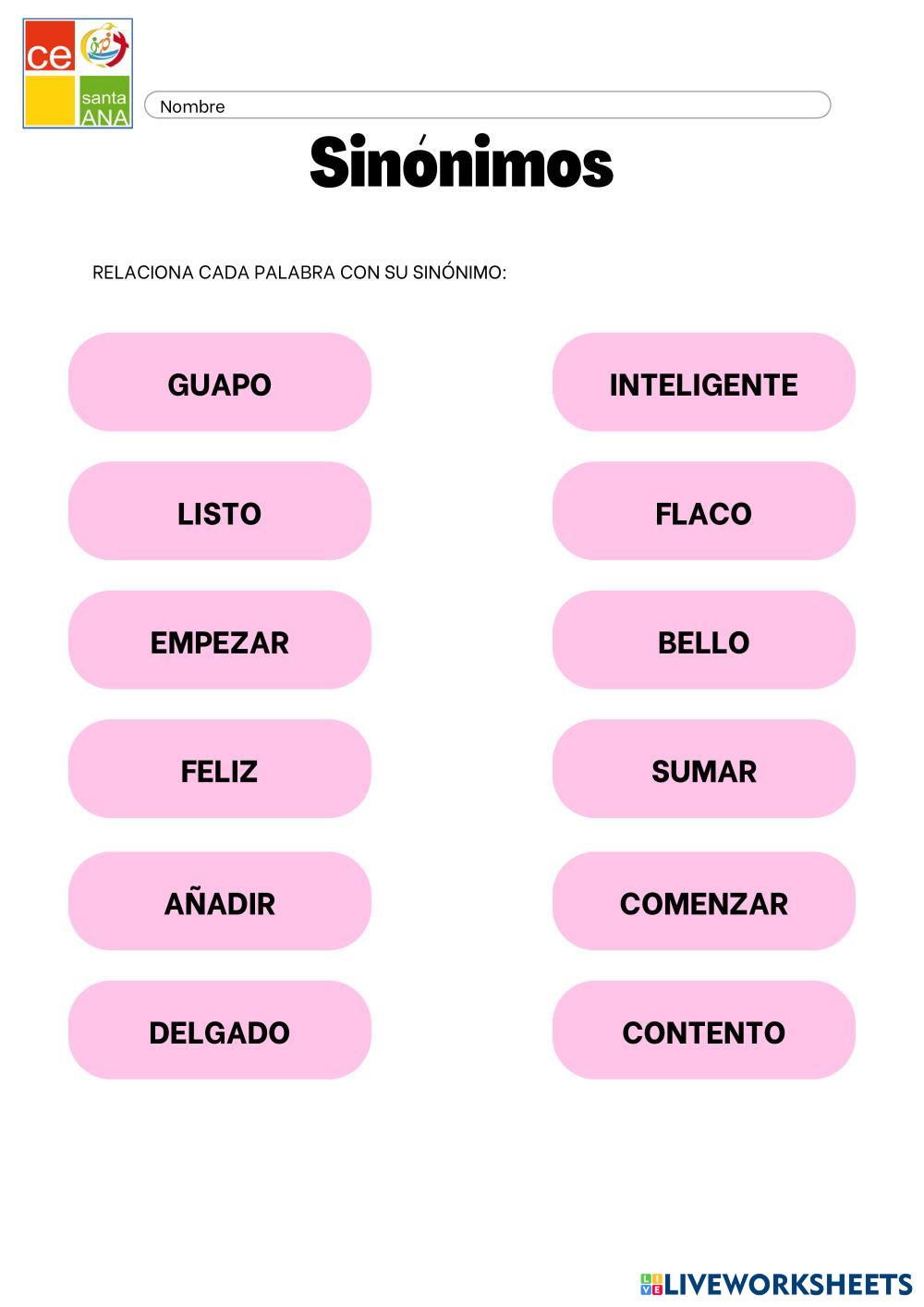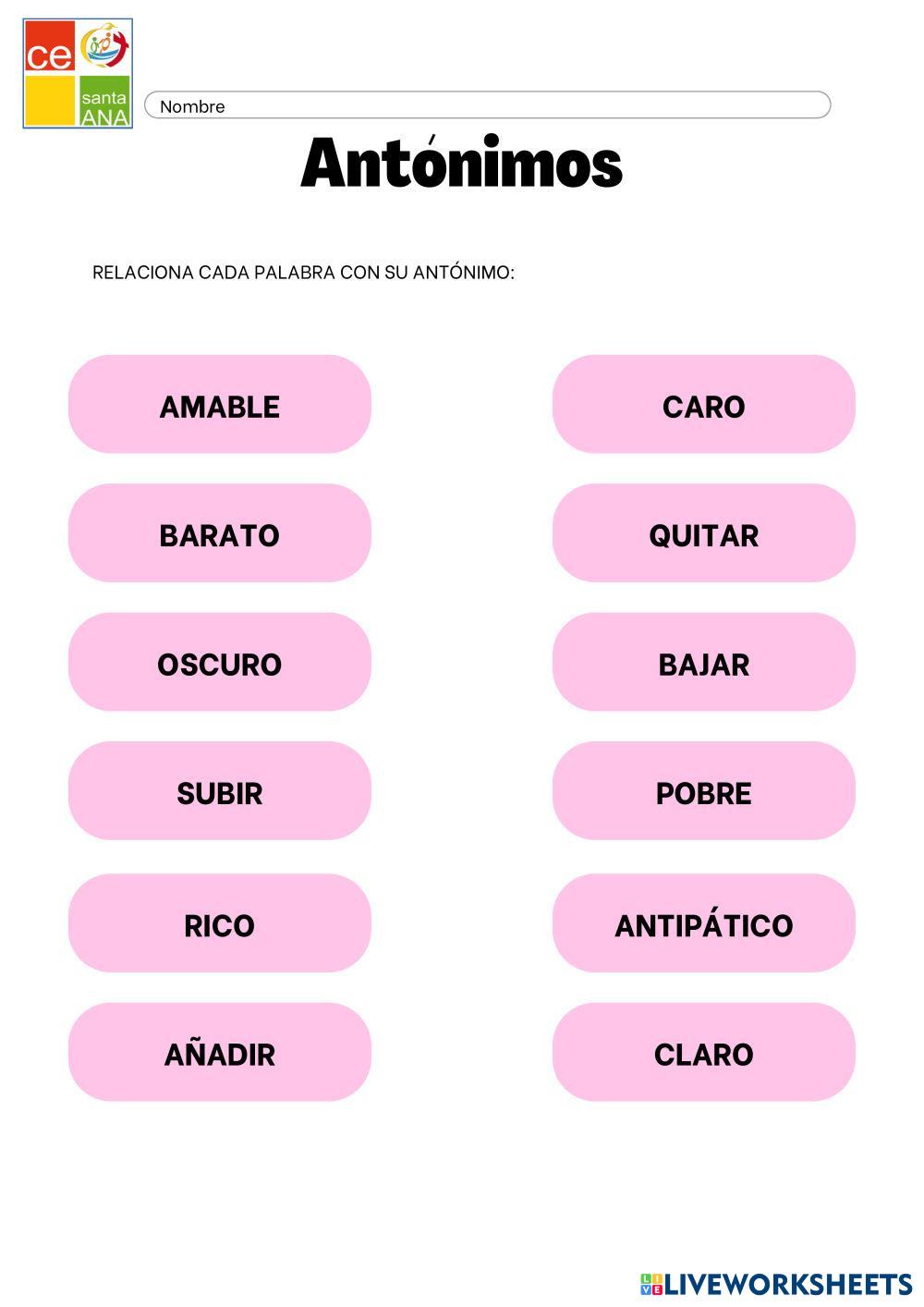 Created by SilviaPintado Lengua Castellana Sinonimos y antonimos Age 7-11 level: 3º primaria Spanish Author's Instructions My Google Classroom Courses × 0 classes selected (0 students total) Quick Access Select all classes (0 classes) All Classes Loading courses... Cancel Share Share to selected Course __COURSE_NAME__ __STUDENT_NAME__ (__STUDENT_EMAIL__) SINÓNIMOS Y ANTÓNIMOS Download Worksheet Validation Check my answers Emails my answers to my teacher Full name Group/level School subject Teacher's email or key code Close Submit Validating worksheet... (12) Your answers have been sent to your teacher. Good luck! OK We encountered an error submitting your answers. Please try again. OK Advertisement | Go Ad Free Created by SilviaPintado Lengua Castellana Sinonimos y antonimos Age 7-11 level: 3º primaria Spanish Author's Instructions