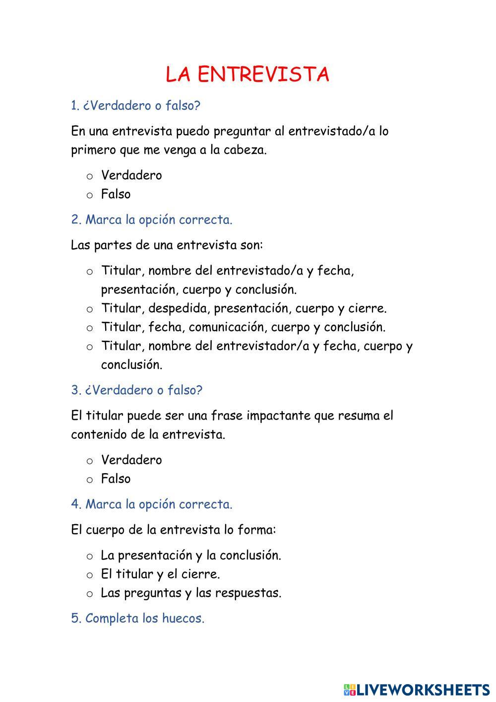 Created by matildemartinm Lengua Castellana La entrevista Age 9-11 level: 4º Spanish Author's Instructions My Google Classroom Courses × 0 classes selected (0 students total) Quick Access Select all classes (0 classes) All Classes Loading courses... Cancel Share Share to selected Course __COURSE_NAME__ __STUDENT_NAME__ (__STUDENT_EMAIL__) La entrevista Download Worksheet Validation Check my answers Emails my answers to my teacher Full name Group/level School subject Teacher's email or key code Close Submit Validating worksheet... (12) Your answers have been sent to your teacher. Good luck! OK We encountered an error submitting your answers. Please try again. OK Advertisement | Go Ad Free Created by matildemartinm Lengua Castellana La entrevista Age 9-11 level: 4º Spanish Author's Instructions