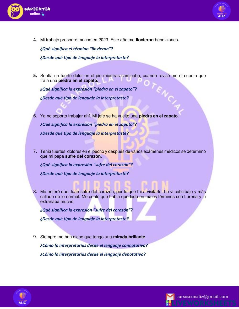 Created byMujer Lengua española Español Age 18+ level: INTERMEDIO Spanish Author's Instructions My Google Classroom Courses × 0 classes selected (0 students total) Quick Access Select all classes (0 classes) All Classes Loading courses... Cancel Share Share to selected Course __COURSE_NAME__ __STUDENT_NAME__ (__STUDENT_EMAIL__) CLAVES CONTEXTUALES Y TIPO DE LENGUAJE Download Worksheet Validation Check my answers Emails my answers to my teacher Full name Group/level School subject Teacher's email or key code Close Submit Validating worksheet... (12) Your answers have been sent to your teacher. Good luck! OK We encountered an error submitting your answers. Please try again. OK Advertisement | Go Ad Free Created byMujer Lengua española Español Age 18+ level: INTERMEDIO Spanish Author's Instructions
