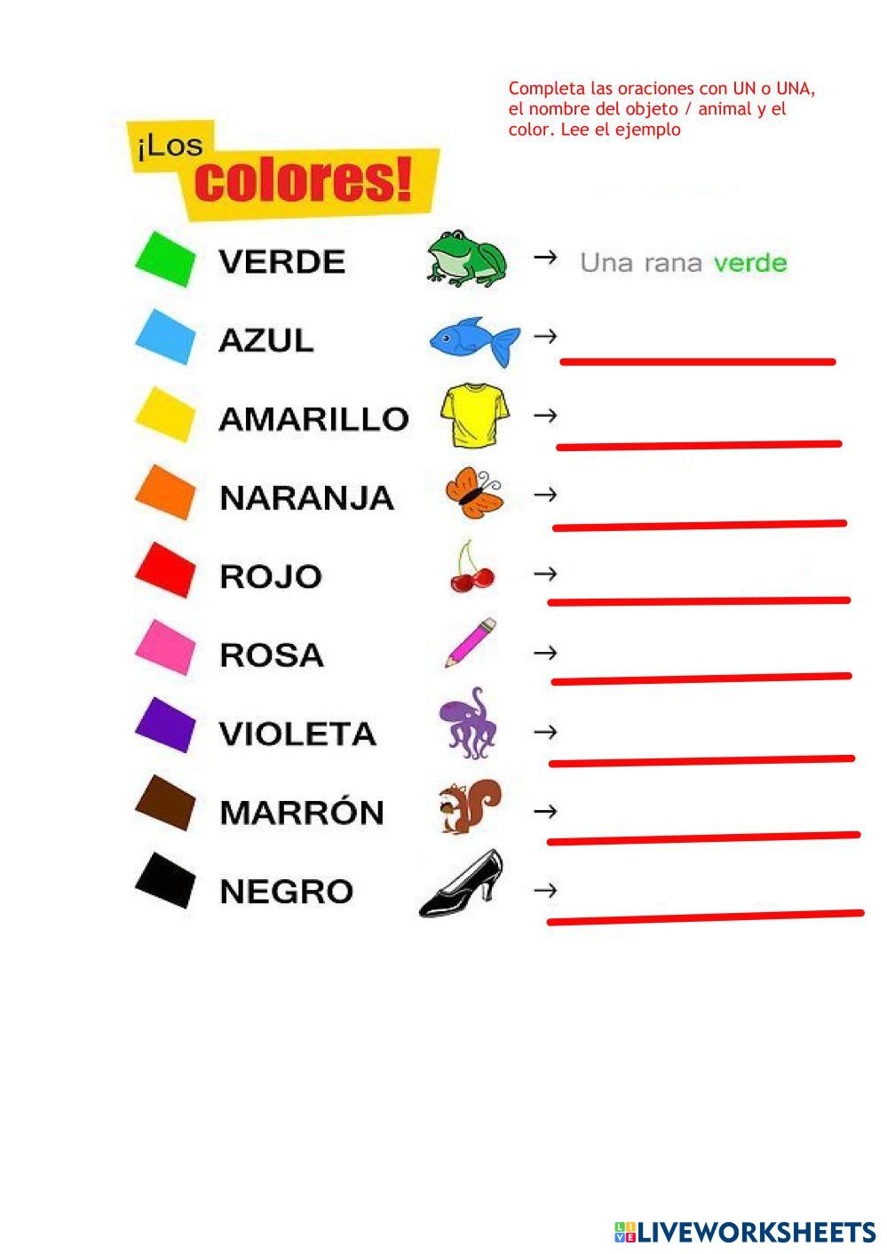 Completar oraciones usando los nombres de los objetos, los colores y los artículos indeterminados Un, Una.