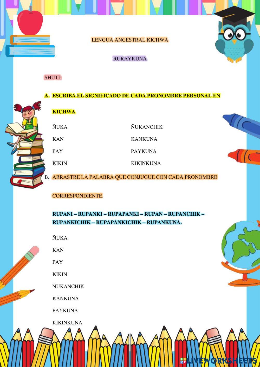 Created by Edd180106 Lengua Kichwa Lengua y Cultura Age 10+ level: principiante Spanish Author's Instructions My Google Classroom Courses × 0 classes selected (0 students total) Quick Access Select all classes (0 classes) All Classes Loading courses... Cancel Share Share to selected Course __COURSE_NAME__ __STUDENT_NAME__ (__STUDENT_EMAIL__) pronombres en kichwa Download Worksheet Validation Check my answers Emails my answers to my teacher Full name Group/level School subject Teacher's email or key code Close Submit Validating worksheet... (12) Your answers have been sent to your teacher. Good luck! OK We encountered an error submitting your answers. Please try again. OK Advertisement | Go Ad Free Created by Edd180106 Lengua Kichwa Lengua y Cultura Age 10+ level: principiante Spanish Author's Instructions