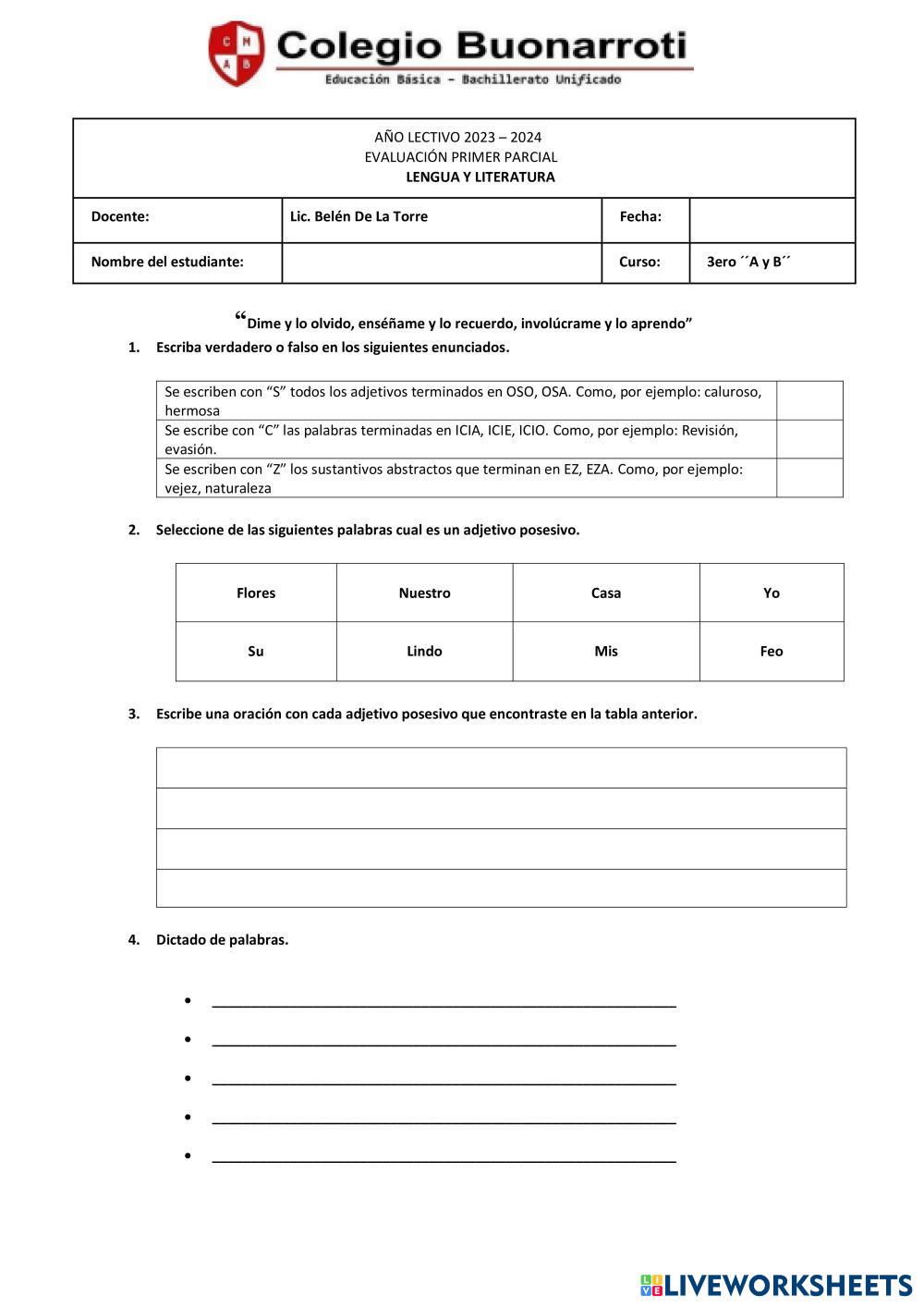 Created byBelén De La Torre Lengua y Literatura Los adjetivos posesivos Age 7-13 level: 3ero de Básica Spanish Author's Instructions My Google Classroom Courses × 0 classes selected (0 students total) Quick Access Select all classes (0 classes) All Classes Loading courses... Cancel Share Share to selected Course __COURSE_NAME__ __STUDENT_NAME__ (__STUDENT_EMAIL__) Evaluación de Lengua Download Worksheet Validation Check my answers Emails my answers to my teacher Full name Group/level School subject Teacher's email or key code Close Submit Validating worksheet... (12) Your answers have been sent to your teacher. Good luck! OK We encountered an error submitting your answers. Please try again. OK Advertisement | Go Ad Free Created byBelén De La Torre Lengua y Literatura Los adjetivos posesivos Age 7-13 level: 3ero de Básica Spanish Author's Instructions
