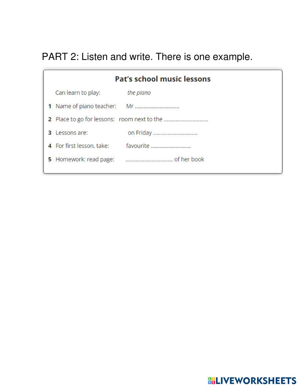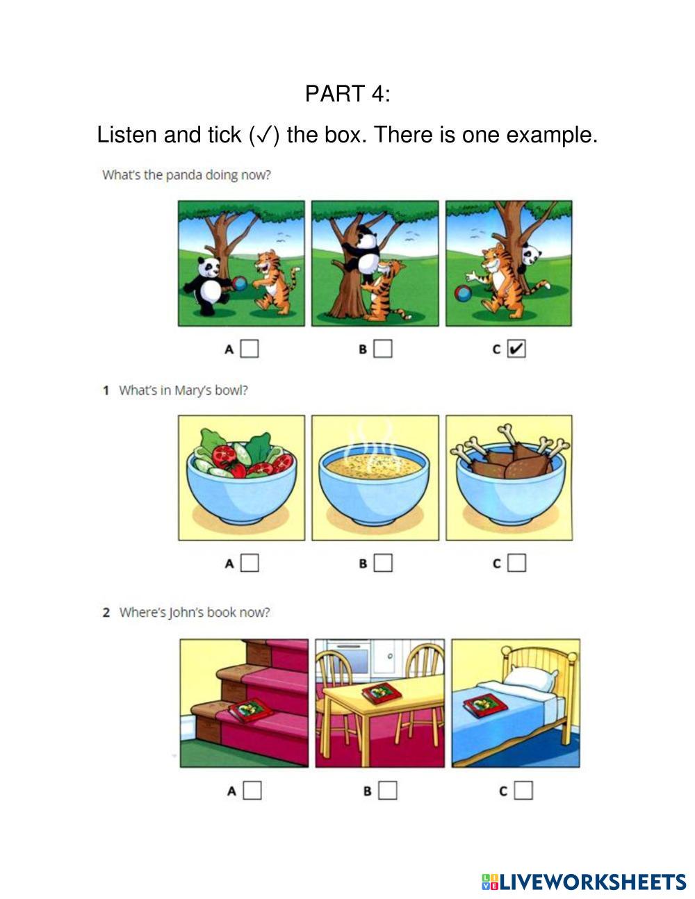 Created by NNSS_Perez Listening Listening Age 4+ level: A1 Spanish Author's Instructions My Google Classroom Courses × 0 classes selected (0 students total) Quick Access Select all classes (0 classes) All Classes Loading courses... Cancel Share Share to selected Course __COURSE_NAME__ __STUDENT_NAME__ (__STUDENT_EMAIL__) SECOND A1 MOVERS LISTENING PRACTICE Download Worksheet Validation Check my answers Emails my answers to my teacher Full name Group/level School subject Teacher's email or key code Close Submit Validating worksheet... (12) Your answers have been sent to your teacher. Good luck! OK We encountered an error submitting your answers. Please try again. OK Advertisement | Go Ad Free Created by NNSS_Perez Listening Listening Age 4+ level: A1 Spanish Author's Instructions