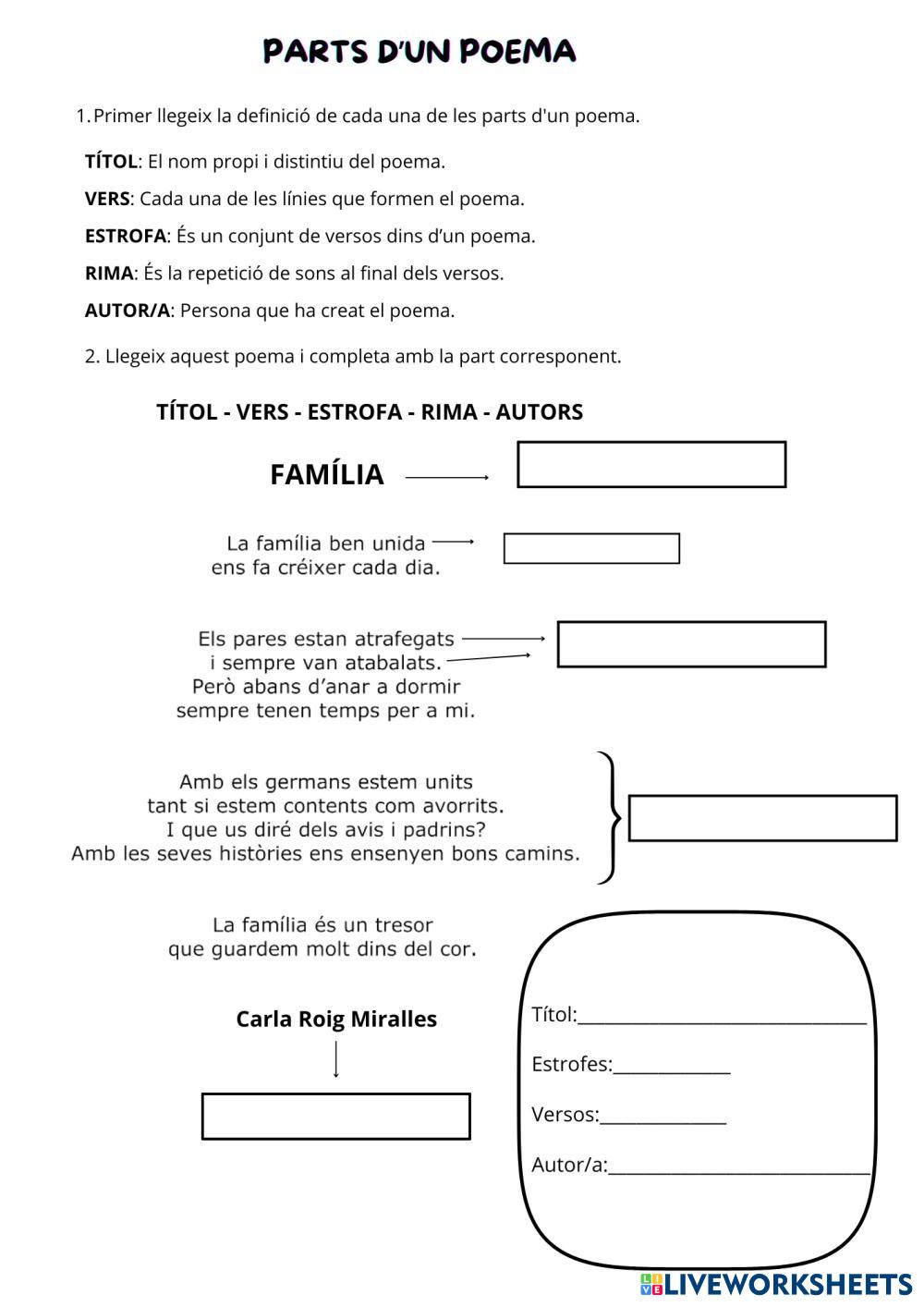 Created byC F D Llengua catalana Poema Age 11-15 level: 5-6 EP Spanish Author's Instructions My Google Classroom Courses × 0 classes selected (0 students total) Quick Access Select all classes (0 classes) All Classes Loading courses... Cancel Share Share to selected Course __COURSE_NAME__ __STUDENT_NAME__ (__STUDENT_EMAIL__) Parts d'un poema Download Worksheet Validation Check my answers Emails my answers to my teacher Full name Group/level School subject Teacher's email or key code Close Submit Validating worksheet... (12) Your answers have been sent to your teacher. Good luck! OK We encountered an error submitting your answers. Please try again. OK Advertisement | Go Ad Free Created byC F D Llengua catalana Poema Age 11-15 level: 5-6 EP Spanish Author's Instructions