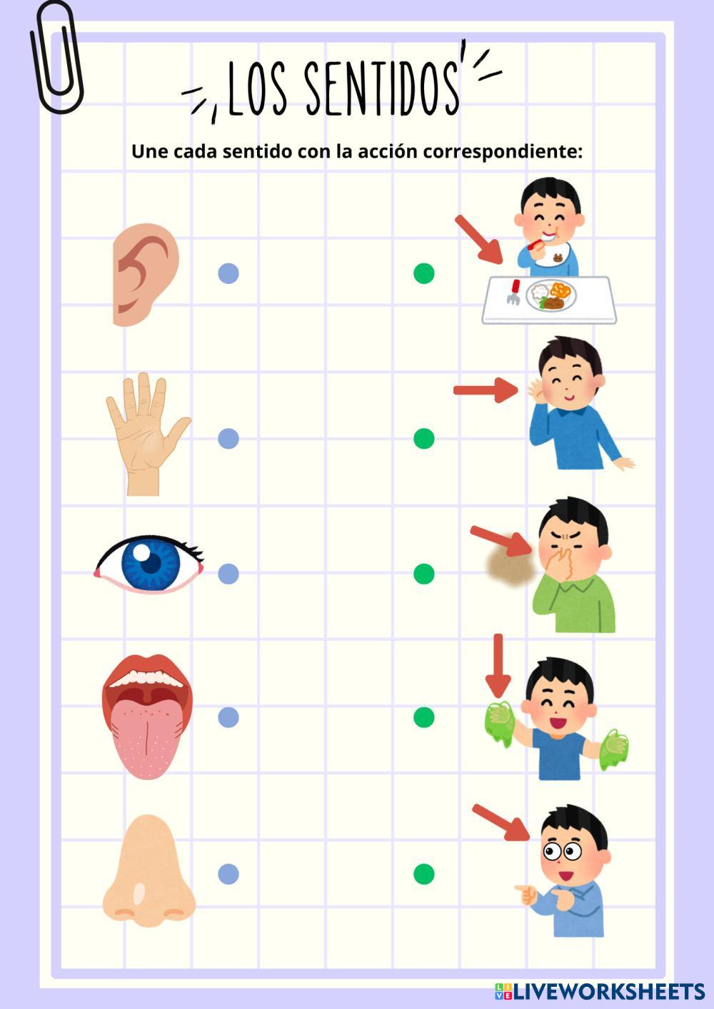 Se trata de una ficha interactiva, en la cual los alumnos y alumnas deben unir el dibujo del sentido con el dibujo correspondiente de la acción que nos ayuda a realizar el mismo.