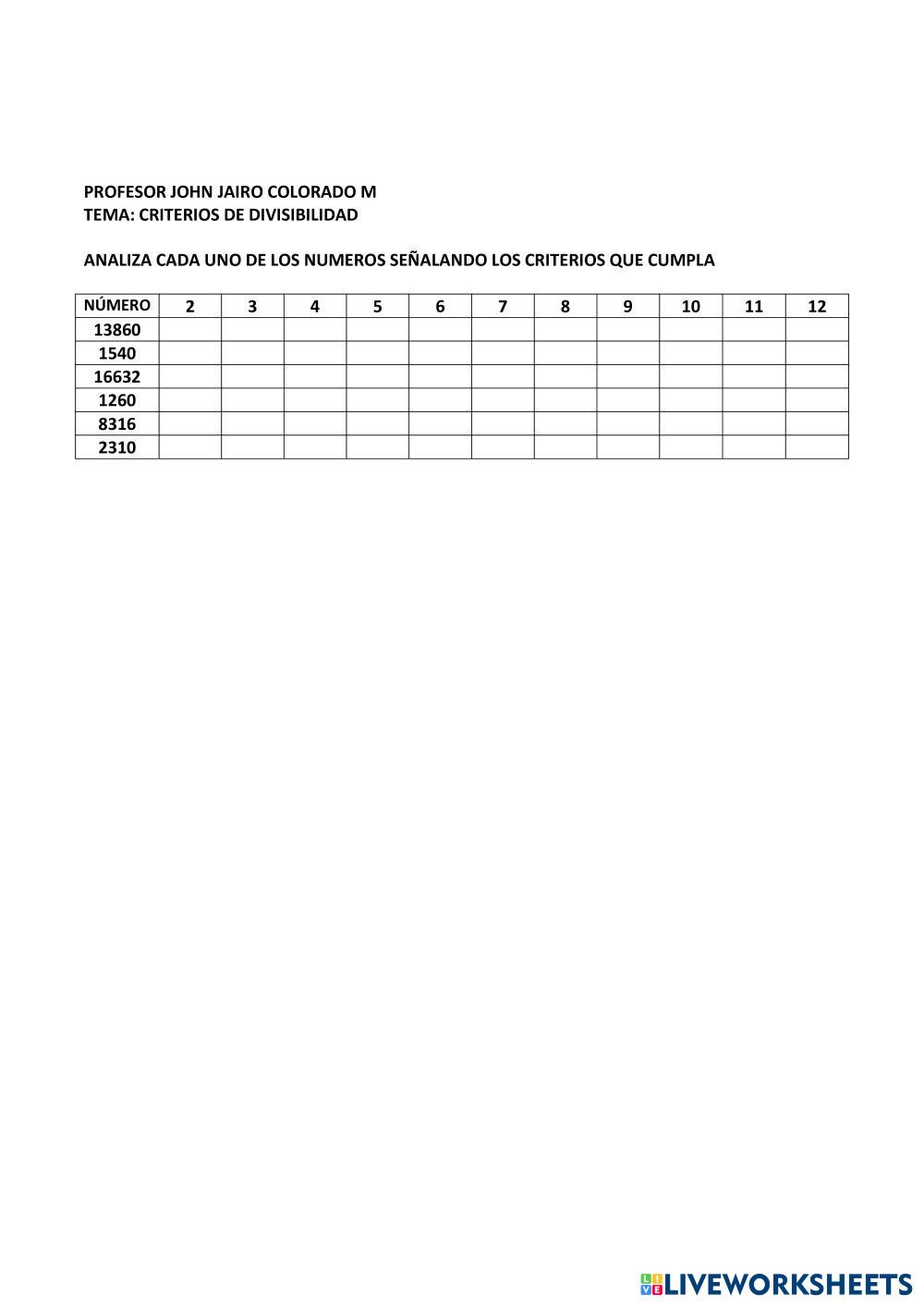 CON ÉSTA ACTIVIDAD SE PRACTICA LOS CRITERIOS DE DIVISIBILIDAD MÁS COMUNES