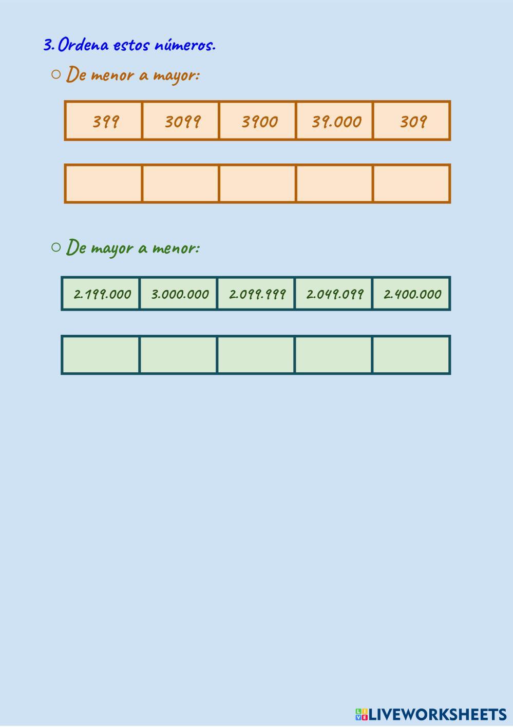 Created byJuan Matemáticas Numeración Age 8-9 level: 5º Ed. Primaria Spanish Author's Instructions COMPARACIÓN y ORDENACIÓN DE NÚMEROS My Google Classroom Courses × 0 classes selected (0 students total) Quick Access Select all classes (0 classes) All Classes Loading courses... Cancel Share Share to selected Course __COURSE_NAME__ __STUDENT_NAME__ (__STUDENT_EMAIL__) COMPARACIÓN DE NÚMEROS Download Worksheet Validation Check my answers Emails my answers to my teacher Full name Group/level School subject Teacher's email or key code Close Submit Validating worksheet... (12) Your answers have been sent to your teacher. Good luck! OK We encountered an error submitting your answers. Please try again. OK Advertisement | Go Ad Free Created byJuan Matemáticas Numeración Age 8-9 level: 5º Ed. Primaria Spanish Author's Instructions COMPARACIÓN y ORDENACIÓN DE NÚMEROS