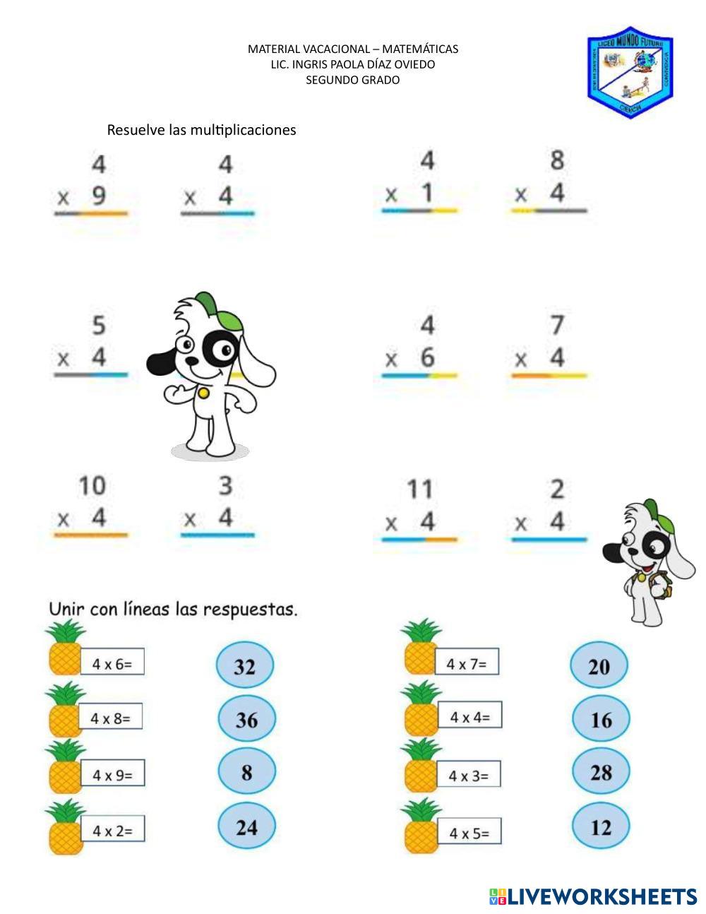 Created byIngris Paola Díaz Oviedo Matemáticas Multiplicaciones Age 7-5 level: grado segundo Spanish Author's Instructions My Google Classroom Courses × 0 classes selected (0 students total) Quick Access Select all classes (0 classes) All Classes Loading courses... Cancel Share Share to selected Course __COURSE_NAME__ __STUDENT_NAME__ (__STUDENT_EMAIL__) Multiplicaciones con la tabla del 4 Download Worksheet Validation Check my answers Emails my answers to my teacher Full name Group/level School subject Teacher's email or key code Close Submit Validating worksheet... (12) Your answers have been sent to your teacher. Good luck! OK We encountered an error submitting your answers. Please try again. OK Advertisement | Go Ad Free Created byIngris Paola Díaz Oviedo Matemáticas Multiplicaciones Age 7-5 level: grado segundo Spanish Author's Instructions