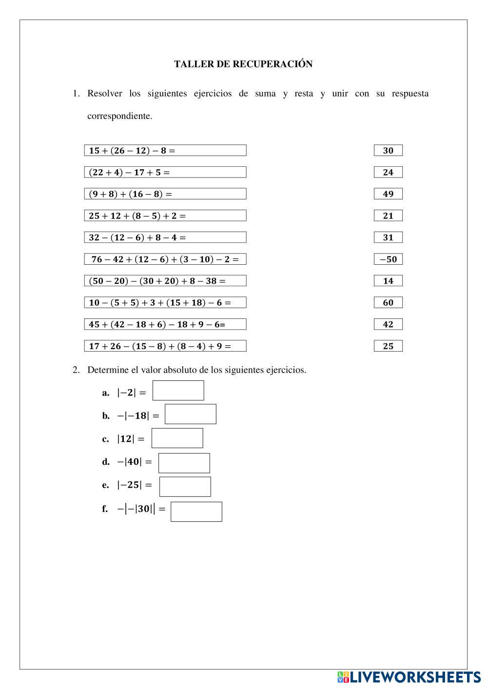 Created byKatherine Tupiza Matemáticas Numeros Enteros Age 12-16 level: secundaria Spanish Author's Instructions My Google Classroom Courses × 0 classes selected (0 students total) Quick Access Select all classes (0 classes) All Classes Loading courses... Cancel Share Share to selected Course __COURSE_NAME__ __STUDENT_NAME__ (__STUDENT_EMAIL__) Taller de recuperación Download Worksheet Validation Check my answers Emails my answers to my teacher Full name Group/level School subject Teacher's email or key code Close Submit Validating worksheet... (12) Your answers have been sent to your teacher. Good luck! OK We encountered an error submitting your answers. Please try again. OK Advertisement | Go Ad Free Created byKatherine Tupiza Matemáticas Numeros Enteros Age 12-16 level: secundaria Spanish Author's Instructions