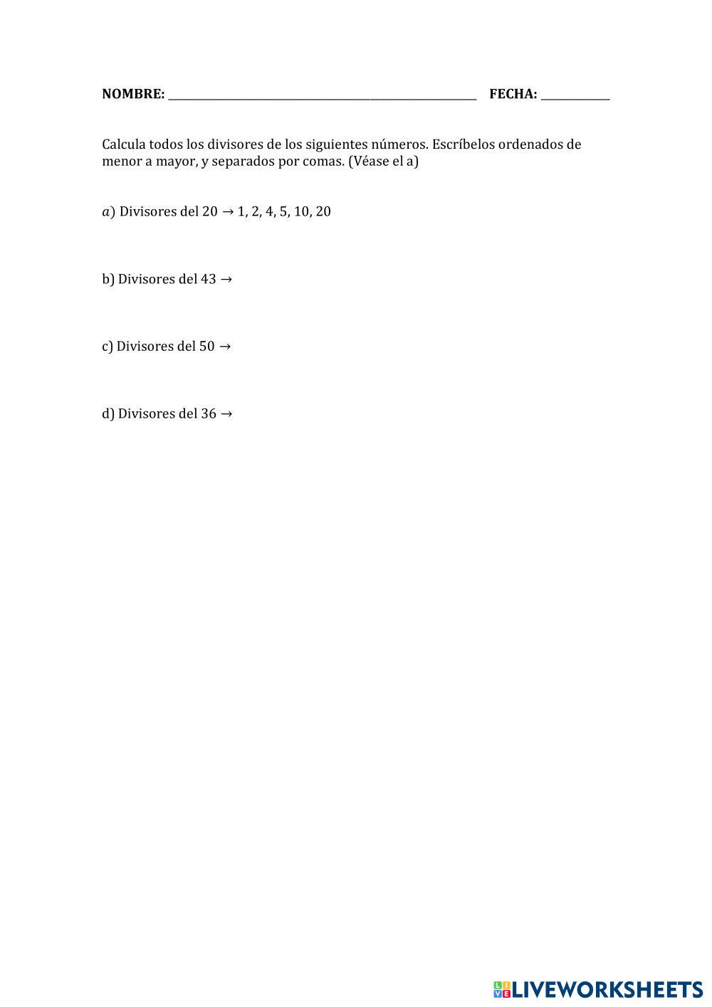Calcula todos los divisores de los siguientes números. Escríbelos ordenados de menor a mayor, y separados por comas.
