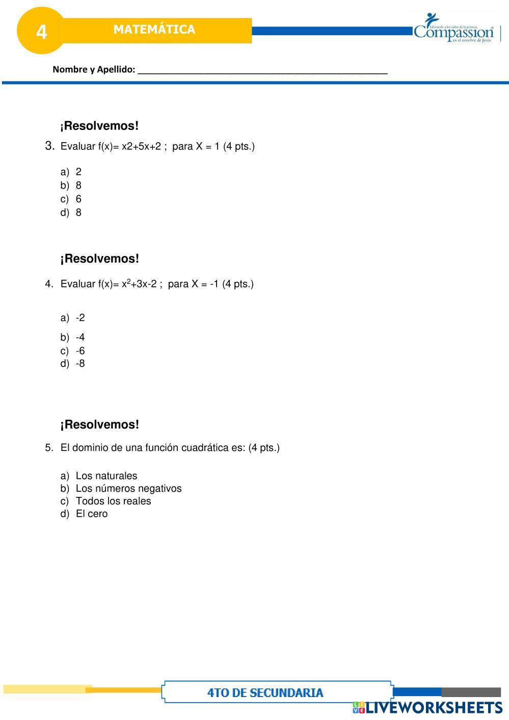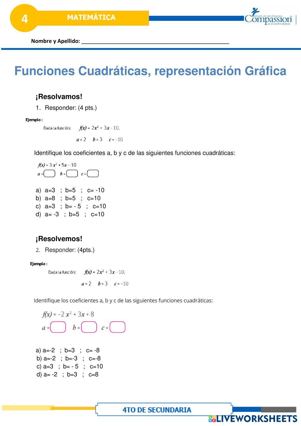 Created byCompassion international del Perú Matemáticas Representación grafica de fracciones propias Age 16+ level: 4to Secundaria Spanish Author's Instructions My Google Classroom Courses × 0 classes selected (0 students total) Quick Access Select all classes (0 classes) All Classes Loading courses... Cancel Share Share to selected Course __COURSE_NAME__ __STUDENT_NAME__ (__STUDENT_EMAIL__) Funciones cuadráticas , representación grafica Download Worksheet Validation Check my answers Emails my answers to my teacher Full name Group/level School subject Teacher's email or key code Close Submit Validating worksheet... (12) Your answers have been sent to your teacher. Good luck! OK We encountered an error submitting your answers. Please try again. OK Advertisement | Go Ad Free Created byCompassion international del Perú Matemáticas Representación grafica de fracciones propias Age 16+ level: 4to Secundaria Spanish Author's Instructions