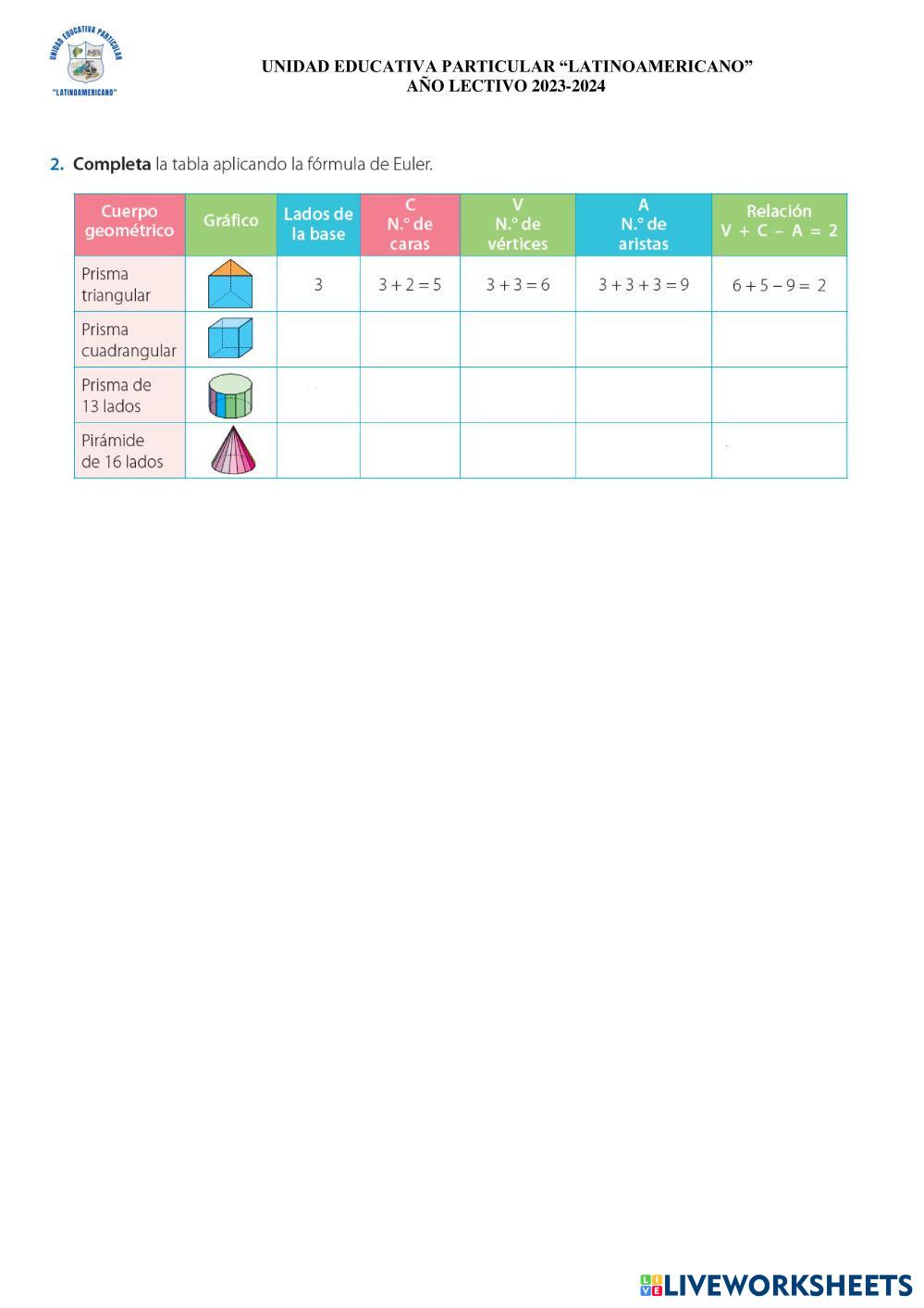 Created by Carla2000 Matemáticas Fórmula de Euler Age 11-17 level: 6to de Básica Spanish Author's Instructions My Google Classroom Courses × 0 classes selected (0 students total) Quick Access Select all classes (0 classes) All Classes Loading courses... Cancel Share Share to selected Course __COURSE_NAME__ __STUDENT_NAME__ (__STUDENT_EMAIL__) EULER Download Worksheet Validation Check my answers Emails my answers to my teacher Full name Group/level School subject Teacher's email or key code Close Submit Validating worksheet... (12) Your answers have been sent to your teacher. Good luck! OK We encountered an error submitting your answers. Please try again. OK Advertisement | Go Ad Free Created by Carla2000 Matemáticas Fórmula de Euler Age 11-17 level: 6to de Básica Spanish Author's Instructions