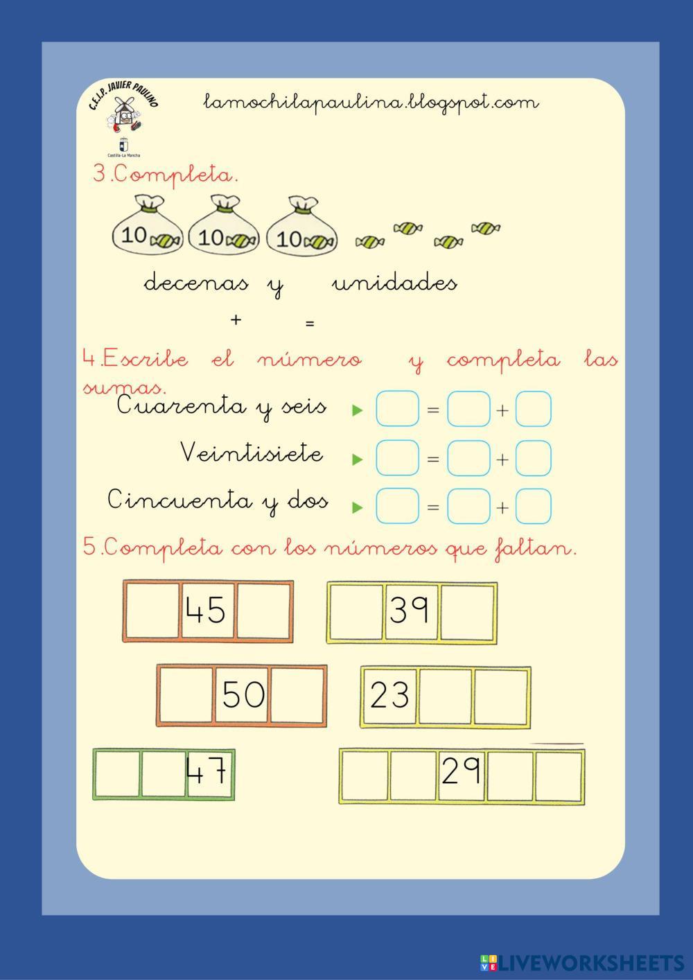 Created byDavid García Blanco Matemáticas Numeración Age 6-10 level: PRIMERO DE PRIMARIA Spanish Author's Instructions My Google Classroom Courses × 0 classes selected (0 students total) Quick Access Select all classes (0 classes) All Classes Loading courses... Cancel Share Share to selected Course __COURSE_NAME__ __STUDENT_NAME__ (__STUDENT_EMAIL__) Números hasta 59 Download Worksheet Validation Check my answers Emails my answers to my teacher Full name Group/level School subject Teacher's email or key code Close Submit Validating worksheet... (12) Your answers have been sent to your teacher. Good luck! OK We encountered an error submitting your answers. Please try again. OK Advertisement | Go Ad Free Created byDavid García Blanco Matemáticas Numeración Age 6-10 level: PRIMERO DE PRIMARIA Spanish Author's Instructions